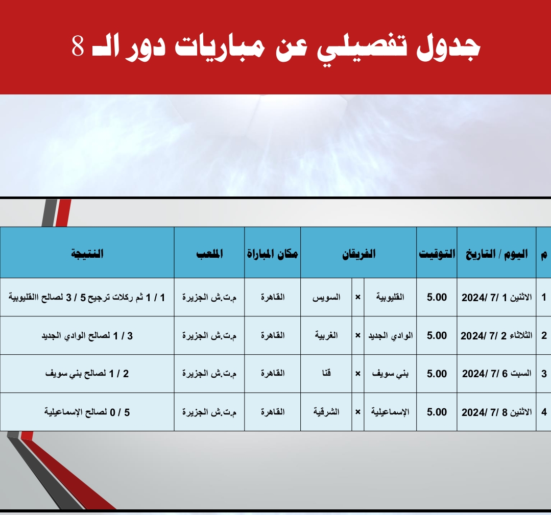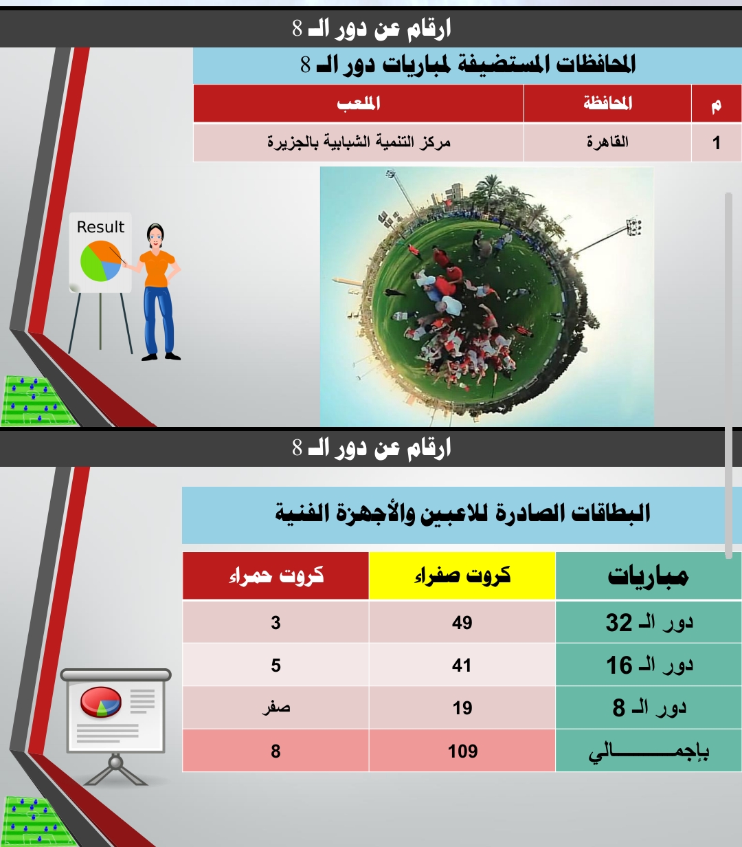 وتستهدف وزارة الشباب والرياضة بقيادة أشرف صبحي أن مركز التمنية الشبابية بالجزيرة بمحافظة القاهرة استضاف مباريات دور الثمانية من الدوري، حيث أقيمت (٤) مباريات، حسمت منها ثلاثة مباريات بالفوز في وقت المباراة الأصلي والتأهل إلي المربع الذهبي، ومباراة وحيدة بضربات الجزاء الترجيحية، وأصدر الحكام خلالها (١٩) بطاقة صفراء فقط للاعبين والأجهزة الفتية والإدارية.