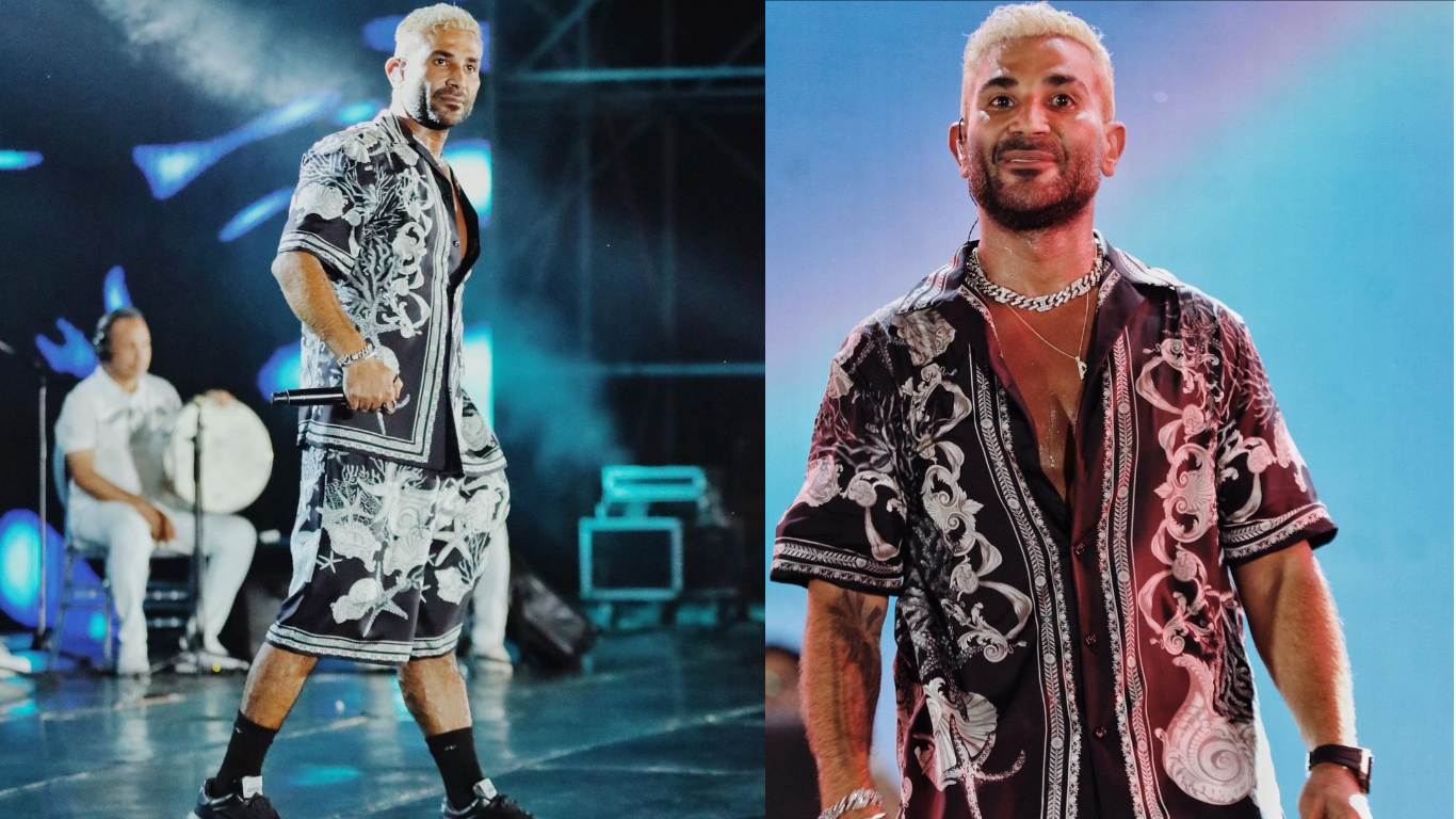 واعتمد أحمد سعد في إطلالته الصيفية على ارتداء شورت طويل وقميص مفتوح باللون الأسود وفيه ورود بيضاء، حذاء رياضي باللون الأسود.