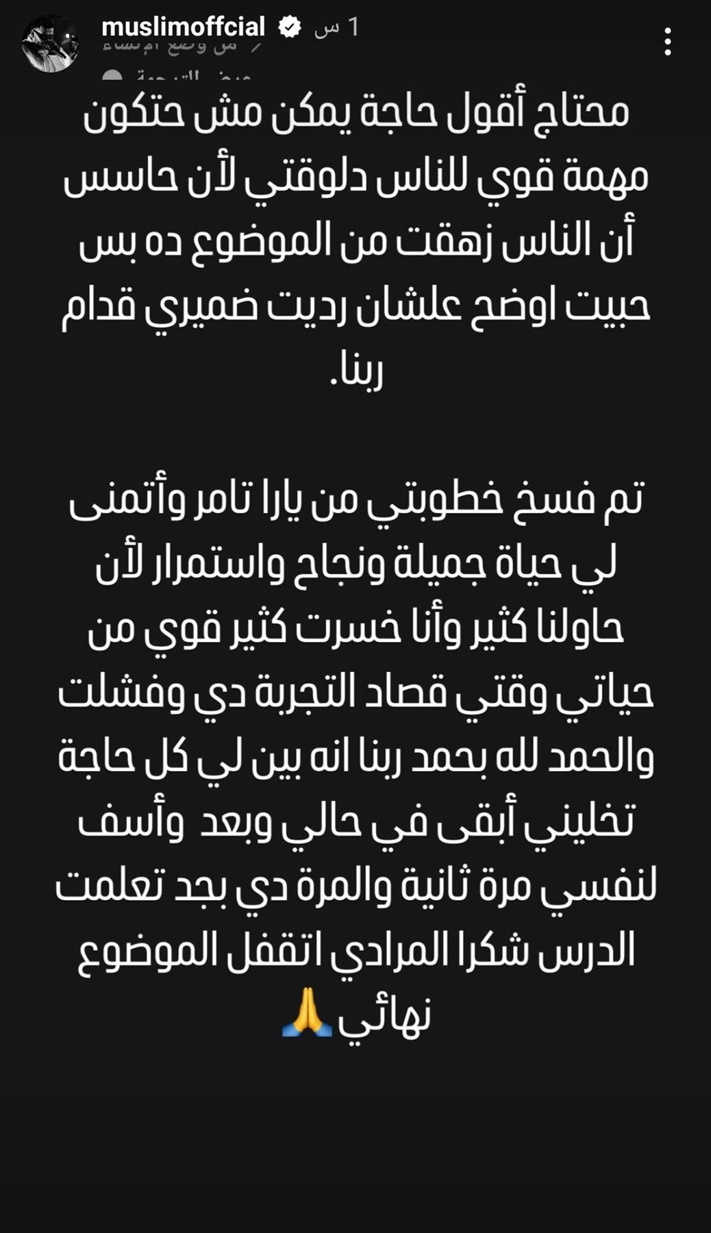 وكتب مسلم في منشوره الذي يرصده موقع تحيا مصر من خلال خاصية استوري: محتاج أقول حاجة يمكن مش حتكون مهمة قوي للناس دلوقتي لأن حاسس أن الناس زهقت من الموضوع ده بس حبيت اوضح علشان رديت ضميري قدام ربنا، تم فسخ خطوبتي من يارا تامر وأتمنى لي حياة جميلة ونجاح واستمرار لأن، حاولنا كثير وأنا خسرت كثير قوي من حياتي وقتي قصاد التجربة دي وفشلت والحمد لله بحمد ربنا انه بين لي كل حاجة تخليني أبقى في حالي وبعد وأسف لنفسي مرة ثانية والمرة دي بجد تعلمت الدرس شكرا المرادي اتقفل الموضوع نهائي.