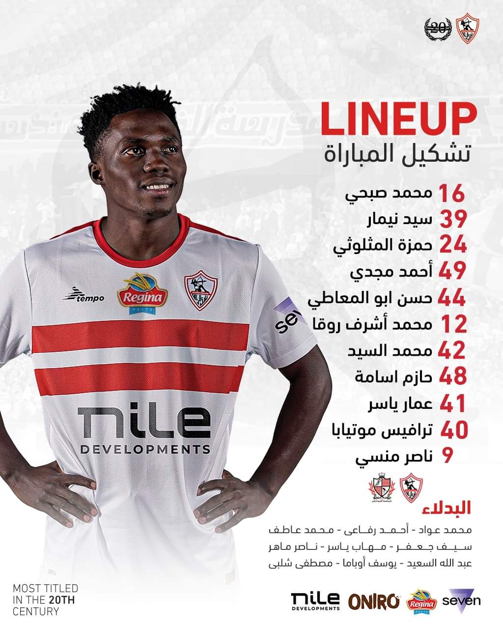 ويتواجد على مقاعد البدلاء كلاً من، محمد عواد وأحمد رفاعي ومحمد عاطف و سيف جعفر ومهاب ياسر وناصر ماهر وعبد الله السعيد ويوسف أوباما ومصطفى شلبي.