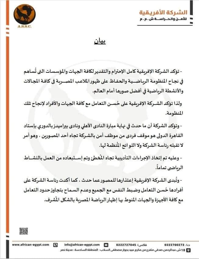الشركة الإفريقية للأمن والحراسة تقدم اعتذار رسمي لمصور مباراة الأهلي وبيراميدز