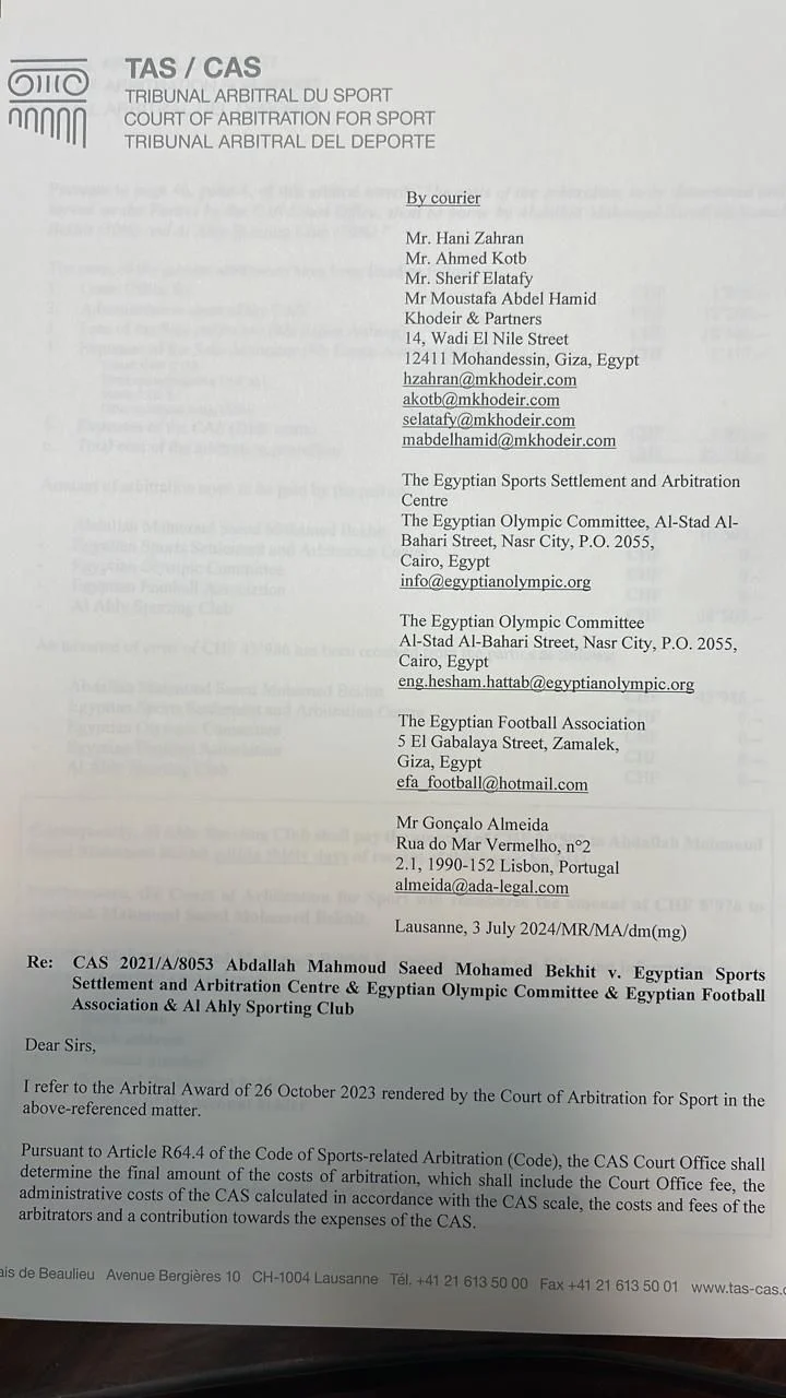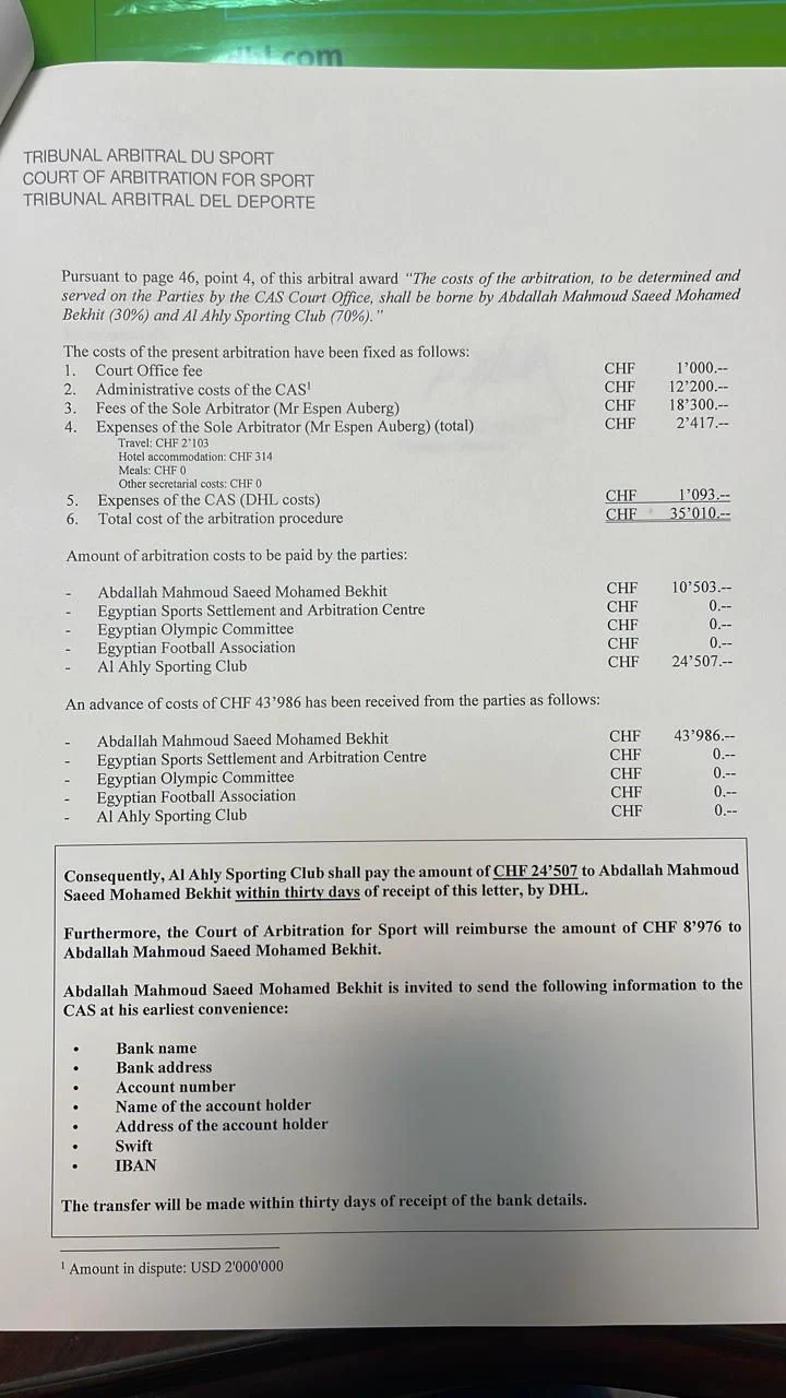 وأكد هاني زهران، أن المحكمة الرياضية قد أصدرت حكما نهائيا يفيد بدفع النادي الأهلي مبلغ 3 ملايين و500 ألف جنية لصالح عبد الله السعيد.
