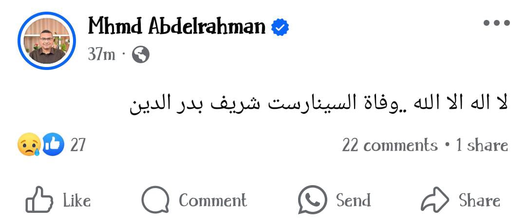 وعلق آخر: "اللهم لا راد لقضائك، إنا لله وإنا إليه راجعون، جاري وصديق طفولتي وأخويا شريف بدر الدين في ذمة الله، لسه كنا بنتكلم وبباركلك على المسلسل، الله يرحمك ويغفر لك ويوسع قبرك ويثبتك عند السؤال ويصبر قلب طنط ليلى و يعوض بناتك خير يارب، هتقابل دينا حبيبتك في الجنة يا حبيبي، في الجنة ونعيمها ياغالي".