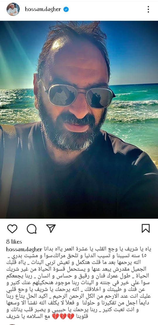 واختتم حسام داغر قائلًا: "يا وجع قلبي عليك أنت عند الأرحم من الكل الرحمن الرحيم أكيد الحل بتاع ربنا دايمًا أجمل من تفكيرنا وحلولنا، وفعلاً لا يكلف الله نفسًا إلا وسعها وأنت تعبت كتير ربنا يرحمك يا حبييي ويصبر قلب يناتك وقلوبنا مع السلامة يا شريف".