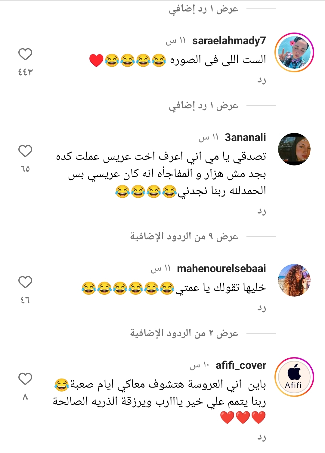 وانهالت التعليقات على صور الخطوبة التي قامت بنشرها، «عايزين نحسن العلاقات يا مي، صورة اشغال شقه بس مع اخت العريس، خليها تقولك يا عمتي، هو انتي ممضيها على حاجه، العروسة هتشوف ايام صعبة معاكي يا مي».