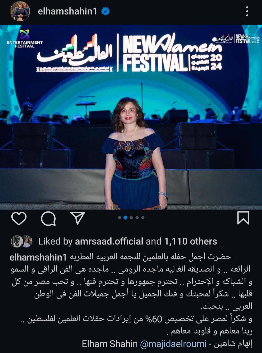 اختتمت النجمة إلهام شاهين حديثها وتطرقت إلى القرار الذي اتخذته مصر والشركة المتحدة للخدمات الإعلامية بتخصيص 60 % من أرباح مهرجان العلمين في دورته الثانية لصالح أشقائنا في فلسطين أهالي غزة كنوع من أنواع التضامن معهم بعد المعاناة التي يعيشونها على يد الاحتلال الصهيوني وما يتسبب فيه من خراب، وأكدت إلهام شاهين تضامنها الكامل مع أهل فلسطين قائلة: “و شكرًا لمصر على تخصيص 60% من إيرادات حفلات العلمين لفلسطين.. ربنا معاهم و قلوبنا معاهم”.
