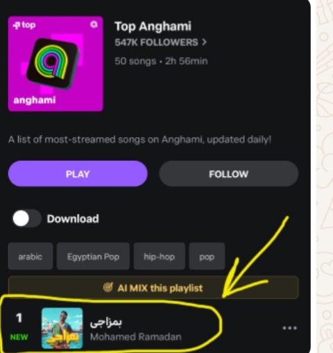 كشفت منصة أنغامي عن قائمة الأغاني الأعلى استماعًا عبر التطبيق الفترة الأخيرة، ليتضح أن الفنان محمد رمضان يتصدر قائمة الأغاني الأعلى نسبة استماع على منصة أنغامي بأغنية بمزاجي، وأصبحت توب 1، وذلك على الرغم من طرحها منذ فترة قصيرة حيث أن محمد رمضان طرح أغنية بمزاجي عبر قناته الرسمية على تطبيق الفيديوهات الشهير يوتيوب يوم 5 يوليو الجاري أي أقل من أسبوعين وحققت الأغنية عبر تطبيق يوتيوب نسب استماع ومشاهدات عالية جيث أنها جاءت على طريقة الفيديو كليب بطريقة Ai ولأول مرة محمد رمضان يخوض تلك التجربة وهو ماجعل الجمهور متحمس للمشاهدة.
