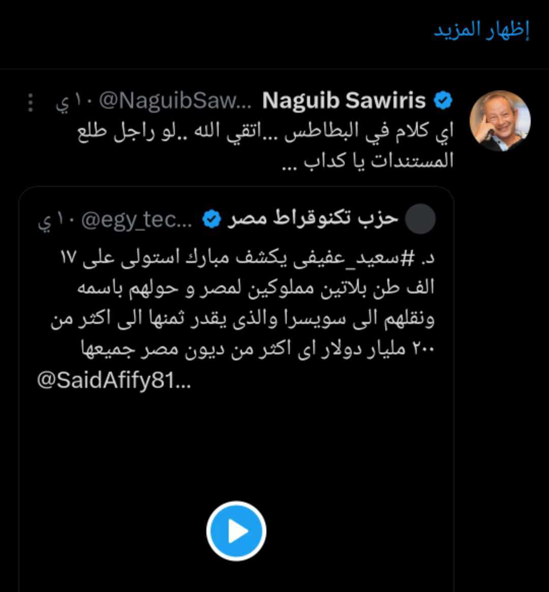 إذ علق رجل الأعمال نجيب ساويرس، عبر صفحته الرسمية على منصة إكس قائلا: "أي كلام في البطاطس …اتقي الله ..لو راجل طلع المستندات يا كداب …".