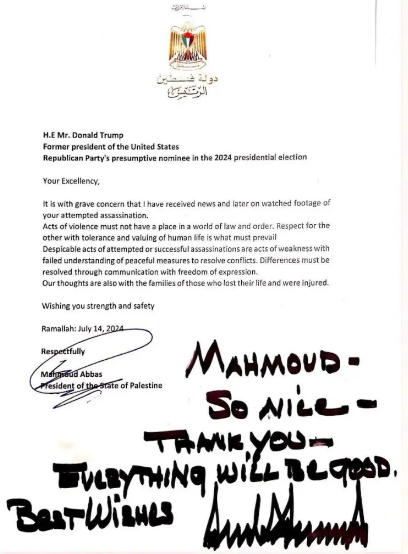 نشر دونالد ترامب الرئيس الأمريكي الأسبق والمرشح الرئاسي والأوفر حظاً للفوز بزعامة البيت الأبيض رسالة تلقاها من الرئيس الفلسطيني محمود عباس "أبو مازن" يدين فيها محاولة الاغتيال التي تعرض لها ترامب خلال تجمع انتخابي في ولاية بنسلفانيا وأصيب بجرح في أذنه.