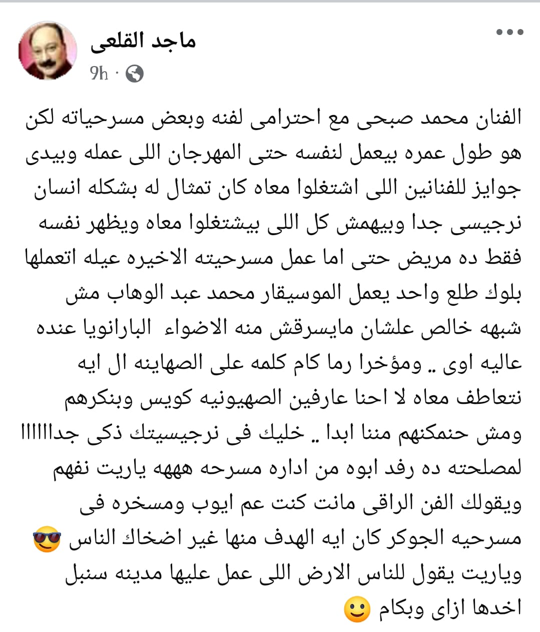نشر الفنان ماجد القلعي منشور له عبر حسابه الشخصي بموقع التواصل الاجتماعي الفيس بوك، رصده لكم موقع تحيا مصر حيث قال ماجد القلعي عن محمد صبحي: "مع احترامى لفنه وبعض مسرحياته لكن هو طول عمره بيعمل لنفسه حتى المهرجان اللي عمله وبيدى جوايز للفنانين اللي اشتغلوا معه".