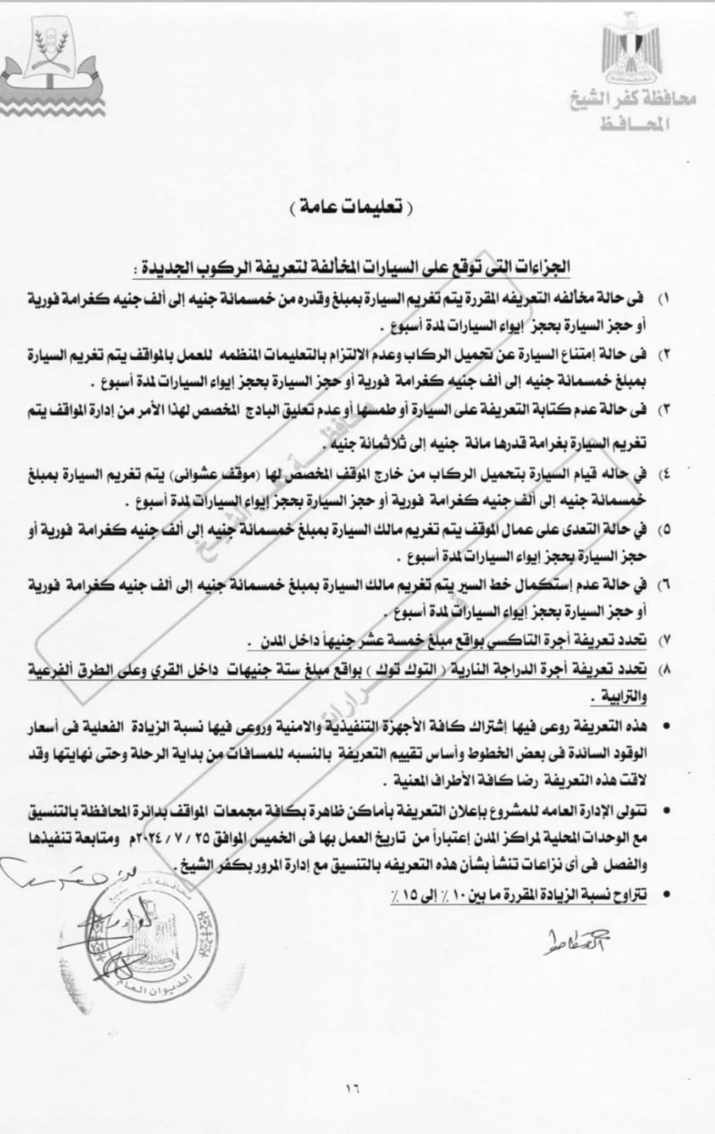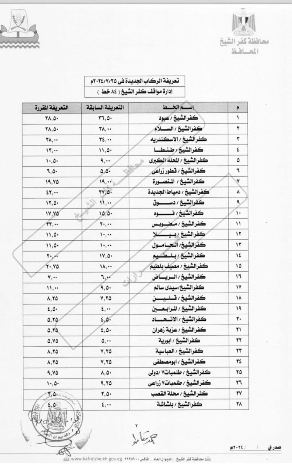 حيث صدق اللواء دكتور علاء عبد المعطي محافظ كفر الشيخ على التعريفة الجديدة لنقل الركاب، وذلك عقب قرار لجنة التسعير التلقائي للمنتجات البترولية المعنية بوزارة البترول بتحريك أسعار المنتجات البترولية اعتبارا من اليوم الخميس