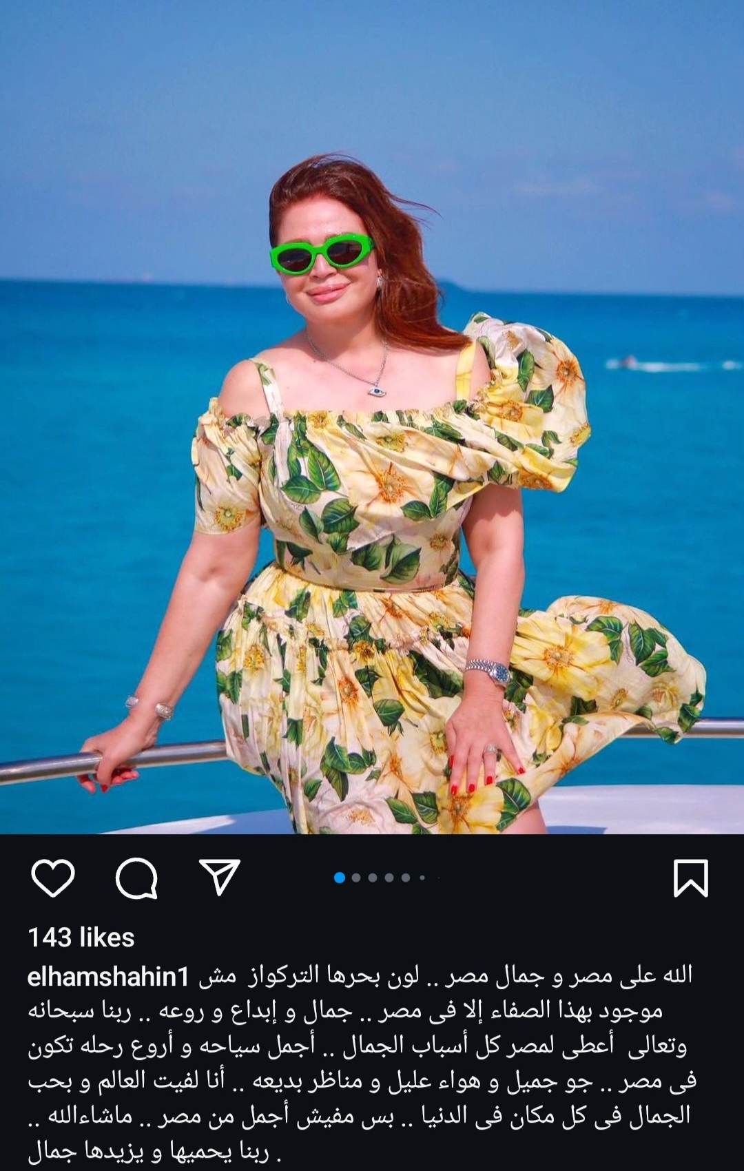 وجاءت كلمات إلهام شاهين كالتالي وفقًا لما رصدها موقع تحيا مصر: “الله على مصر و جمال مصر .. لون بحرها التركواز مش موجود بهذا الصفاء إلا فى مصر .. جمال و إبداع وروعه .. ربنا سبحانه وتعالى أعطى لمصر كل أسباب الجمال .. أجمل سياحه و أروع رحله تكون في مصر .. جو جميل و هواء عليل و مناظر بديعه .. أنا لفيت العالم و بحب الجمال في كل مكان فى الدنيا .. بس مفيش أجمل من مصر .. ما شاء الله، ربنا يحميها و يزيدها جمال”.