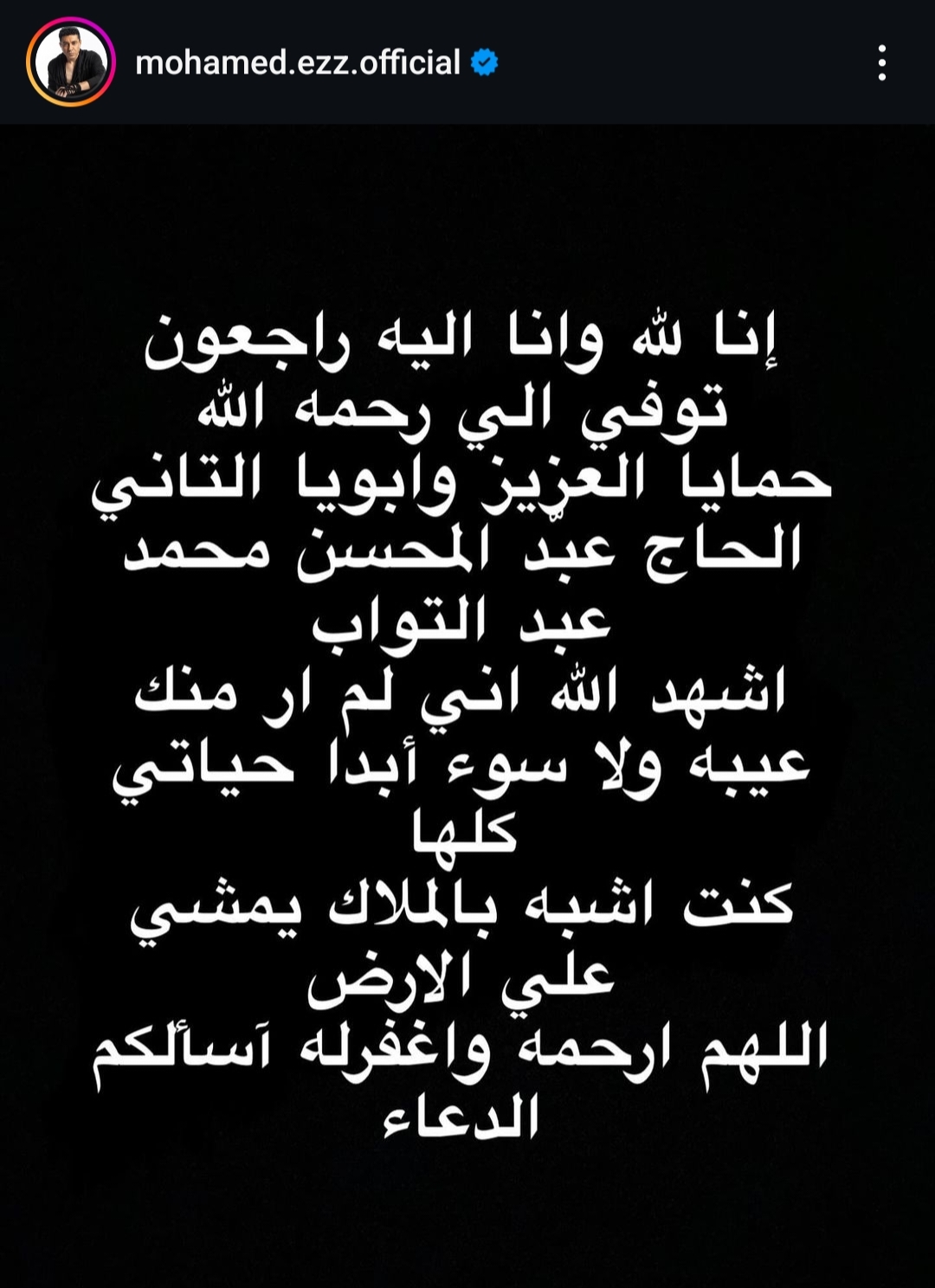 محمد عز يعلن وفاة والد زوجته: أشهد الله أني لم أر منك سوء طوال حياتي