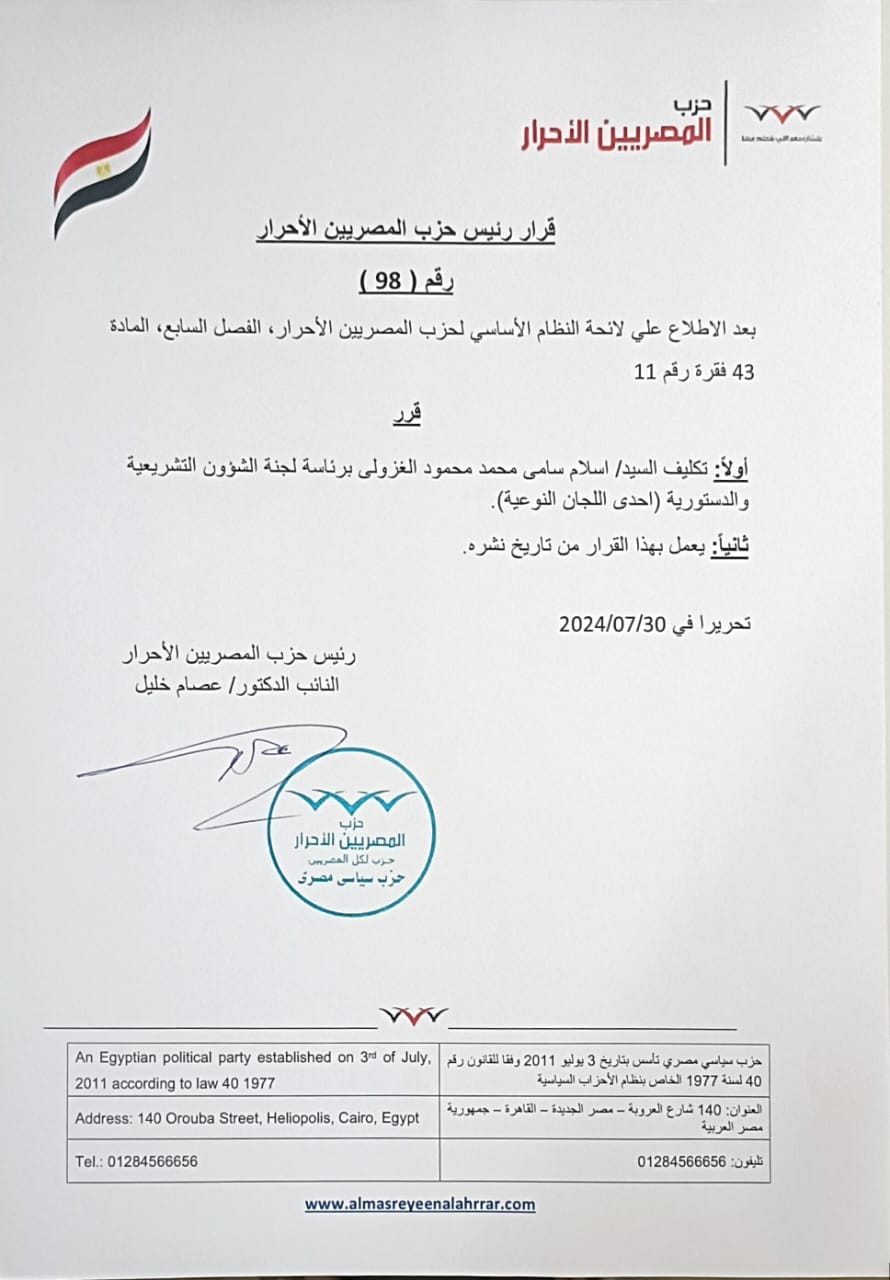 أصدر النائب الدكتور عصام خليل رئيس حزب المصريين الأحرار، قرارًا بتكليف اسلام الغزولي برئاسة لجنة الشؤون التشريعية والدستورية بالحزب.