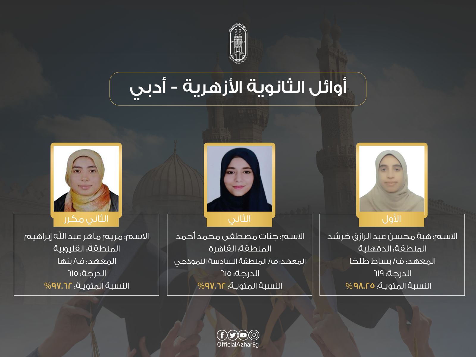 وجاءت المراكز الأولى في الشهادة الثانوية الأزهرية لهذا العام في القسم الأدبي: المركز الأول: هبة محسن عبد الرازق خرشد، من معهد بساط طلخا بالدقهلية، بمجموع 619 بنسبة (98.25%)، المركز الثاني: جنات مصطفى محمد أحمد حمدان، من معهد فتيات المنطقة السادسة النموذجي بالقاهرة، بمجموع 615 بنسبة (97.62%)، المركز الثاني مكرر: مريم ماهر عبد الله إبراهيم النجار، من معهد فتيات بنها بالقليوبية، بمجموع 615 بنسبة (97.62%).