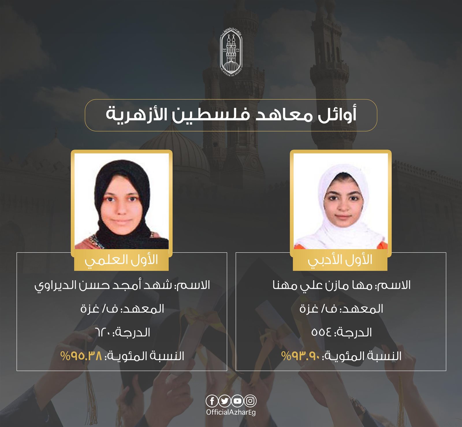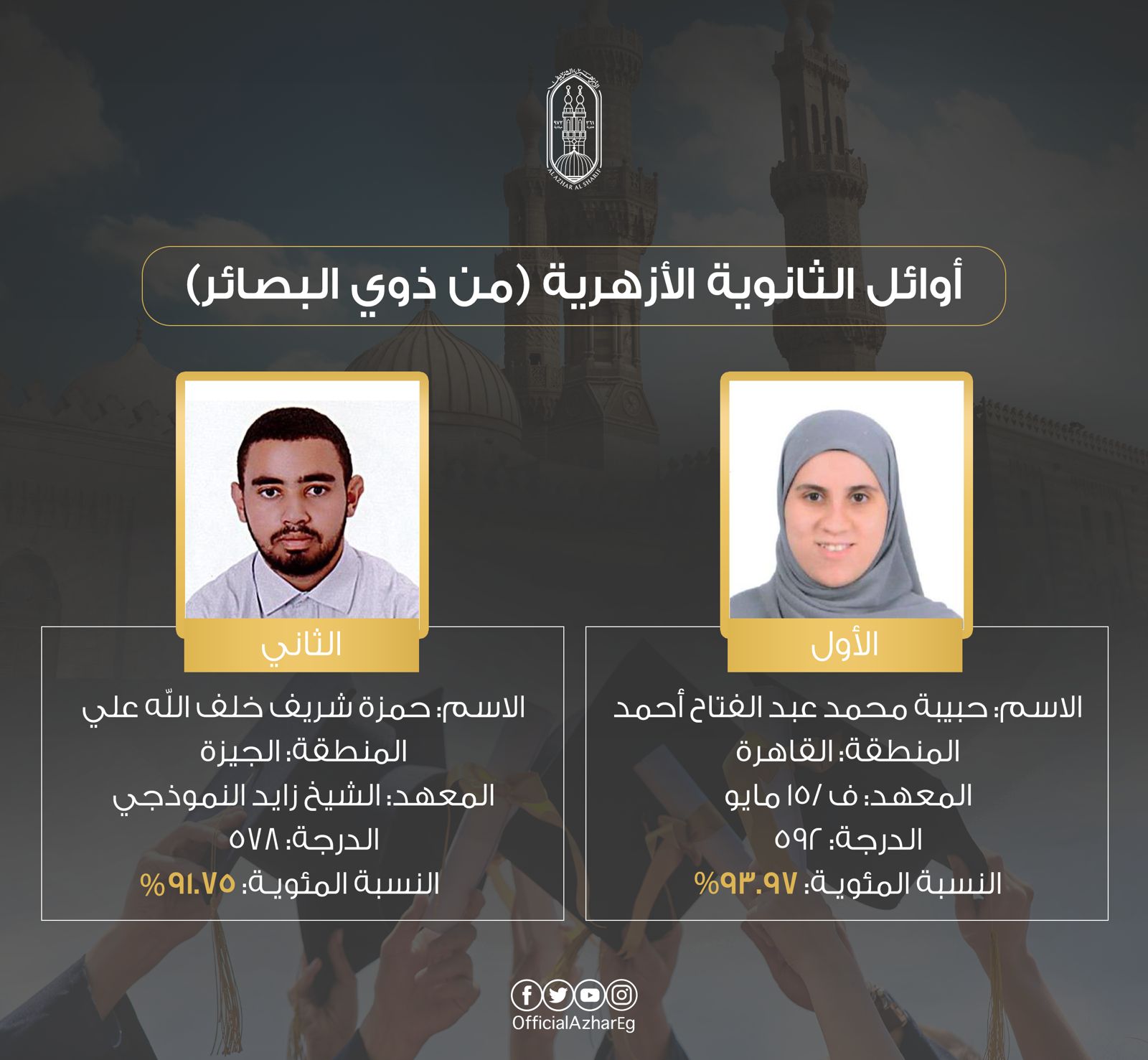 وفي أوائل الجمهورية (كفيف) جاء في المركز الأول الطالبة حبيبة محمد عبد الفتاح أحمد، من معهد فتيات 15 مايو بالقاهرة، بمجموع 592 بنسبة (93.97%)، وجاء في المركز الثاني الطالب حمزة شريف خلف الله علي، من معهد الشيخ زايد النموذجي بالجيزة، بمجموع 578 بنسبة (91.75%). أما أوائل معاهد فلسطين الأزهرية فجاءت الطالبة شهد أمجد حسن الديراوي، من معهد فتيات غزة في المركز الأول على القسم العلمي بمجموع 620 ونسبة (95.38%)، وجاءت الطالبة مها مازن علي مهنا، من معهد فتيات غزة في المركز الأول على القسم الأدبي بمجموع 554 ونسبة (93.90%).