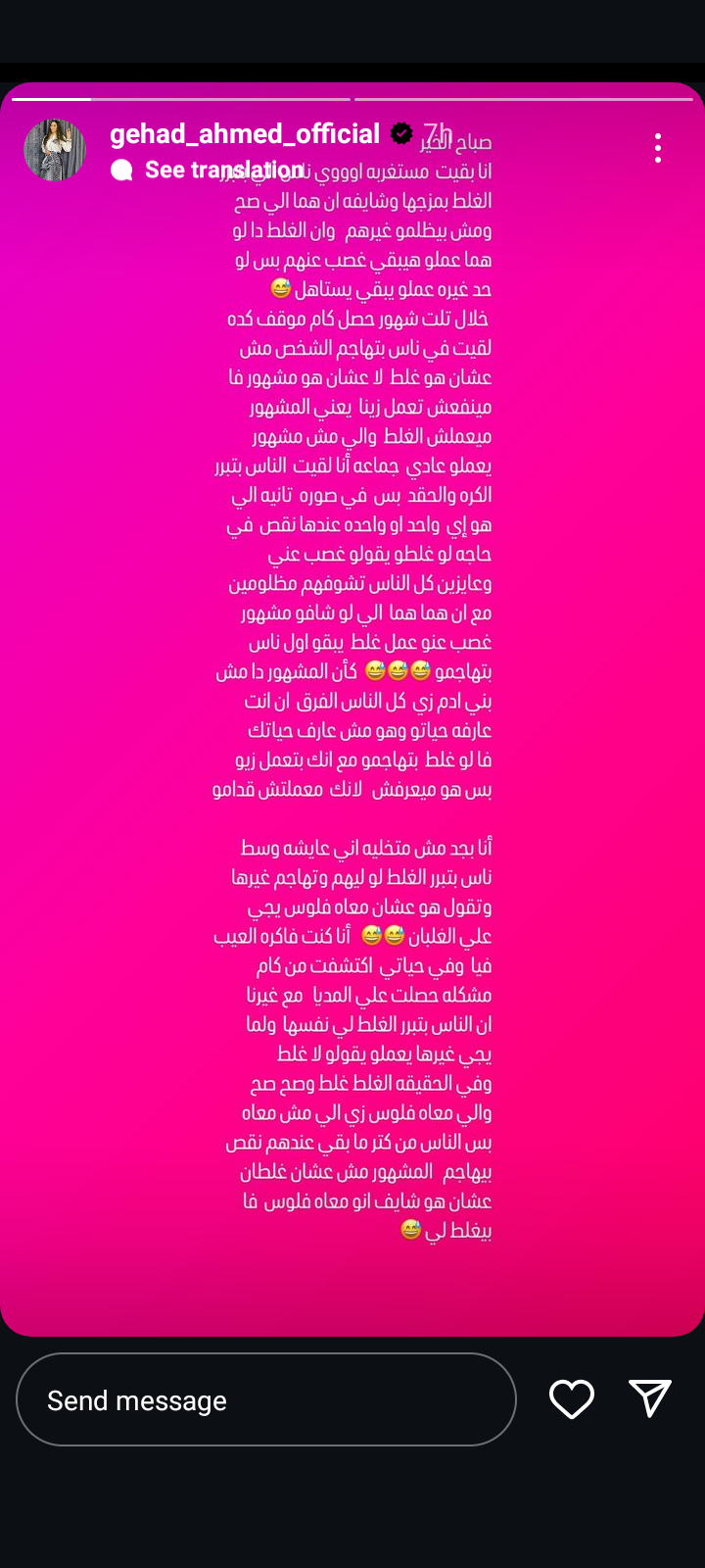 وكتب زوجة عصام صاصا في ستوري عبر حسابها الرسمي بموقع تبادل الصور والفيديوهات انستجرام في منشور رصده موقع تحيا مصر منذ قليل، رسالة تلوم بها الجمهور على تربصهم المستمر لأفعال المشاهير على عكس الأشخاص العادية، فقالت: أنا مستغربة اوي في ناس شايفة الغلط بمزاجها وشايفة إن هما اللي صح ومش بيظلموا غيرهم، وإن الغلط دا لو هما عملوه هيبقى غصب عنهم بس لو حد غيرهم عملوا يبقى يستاهل، خلال 3 شهور حصل كام موقف كده، لقيت ناس بتهاجم الشخص مش علشان هو غلط لأ، علشان هو مشهور، ما مينفعش تعمل زينا يعني المشهور ميعملش الغلط والى مش مشهور يعملوا عادي.