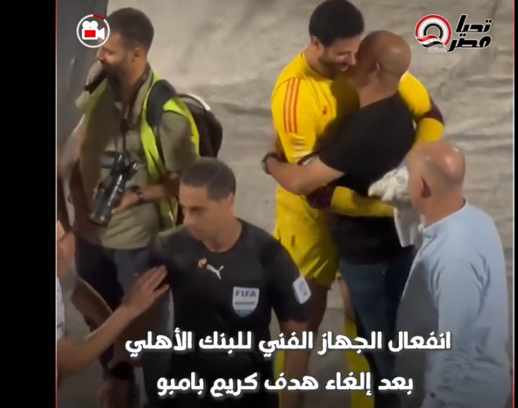 شهدت مباراة الأهلي والبنك الأهلي لقطة مثيرة في نهاية المباراة، وذلك بعد إلغاء هدف كريم بامبو في نهاية المباراة، وفاز النادي الأهلي بهدف مقابل لا شيء على البنك الأهلي، واعترض طارق مصطفى مدرب البنك الأهلي على أمين عمر حكم المباراة وتحدث معه، وتدخل محمد الشناوي حارس الأهلي لاحتواء الأزمة، ويستعرض موقع تحيا مصر التفاصيل.