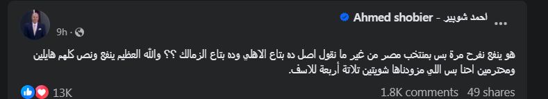 تحيا مصر، وكتب شوبير على حسابه الشخصي بمواقع التواصل الاجتماعي "فيس بوك": هو ينفع نفرح مرة بس بمنتخب مصر من غير ما نقول اصل ده بتاع الاهلي وده بتاع الزمالك ؟؟".