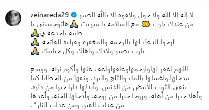 لا إله إلا الله ولا حول ولا قوة إلا بالله، الصبر من عندك يا رب، مع السلامة يا ميريت، هتوحشيني يا طيبة يا جدعة، أرجو الدعاء لها بالرحمة والمغفرة وقراءة الفاتحة.. يا رب يصبر ولادك وأهلك وكل حبايبك.. اللهم اغفر لها وارحمها وعافها واعف عنها وأكرم نزلها، ووسع مدخلها، واغسلها بالماء والثلج والبرد، ونقها من الخطايا كما ينقى الثوب الأبيض من الدنس، وأبدلها دارا خيرا من دارها، وأهلا خيرا من أهلها، وزوجا خيرا من زوجها، وأدخلها الجنة، وأعذها من عذاب القبر، ومن عذاب النار.