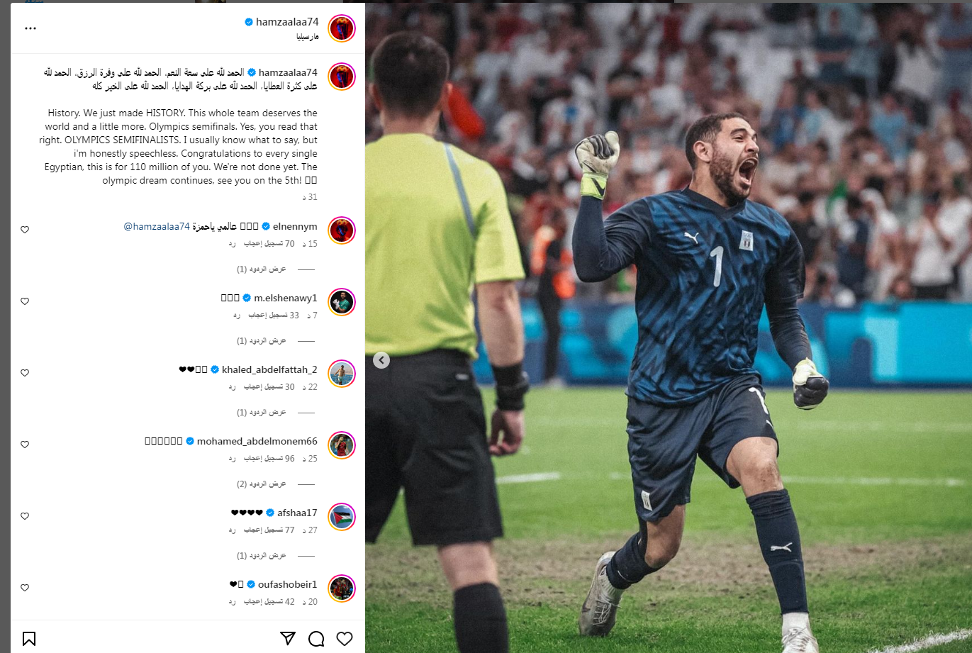 وأختتم حمزة علاء قائلاً:" لقد صنعنا التاريخ هذا الفريق بأكمله يستحق العالم وأكثر من ذلك بقليل، نصف نهائي الأولمبياد نعم، لقد قرأت ذلك بشكل صحيح، المتأهلون لنصف نهائي الأولمبياد. عادةً ما أعرف ما أقول، لكنني بصراحة عاجز عن الكلام، مبروك لكل مصري، ده لـ 110 مليون منكم. لم ننتهي بعد، الحلم الأولمبي مستمر، نراكم في الخامس".