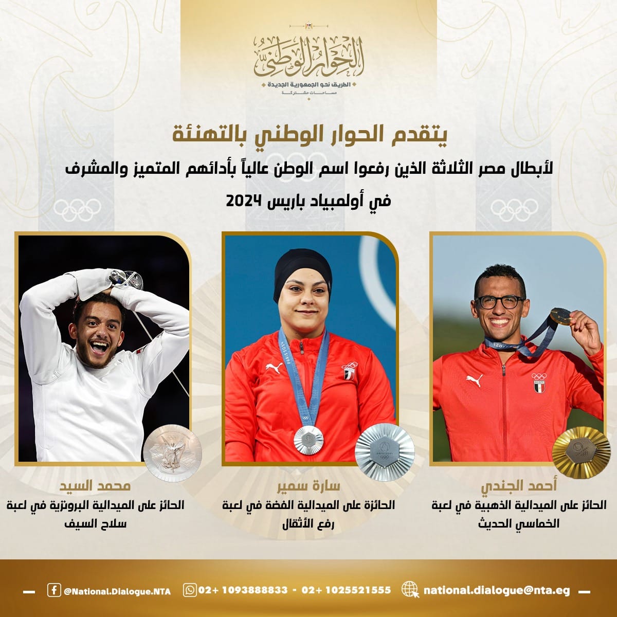 تقدم الحوار الوطني بالتهنئة لأبطال مصر الثلاثة الذين رفعوا اسم الوطن عالياً بأدائهم المتميز والمشرف في أولمبياد باريس ٢٠٢٤م، وهم: أحمد الجندي الحائز على الميدالية الذهبية في لعبة الخماسي الحديث وسارة سمير الحائزة على الميدالية الفضة في لعبة رفع الأثقال ومحمد السيد الحائز على الميدالية البرونزية في لعبة سلاح السيف.