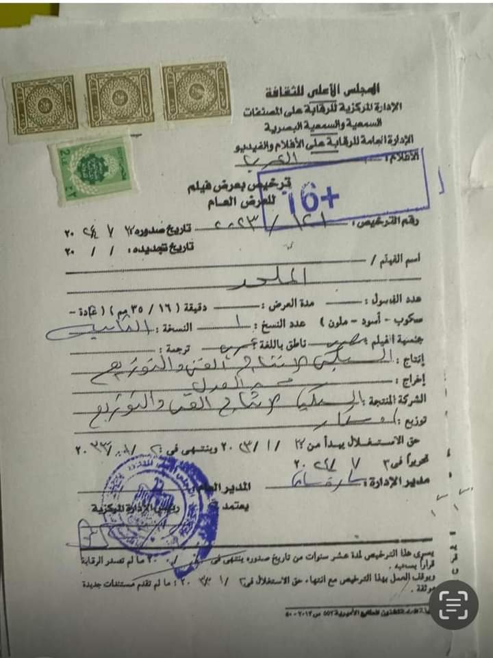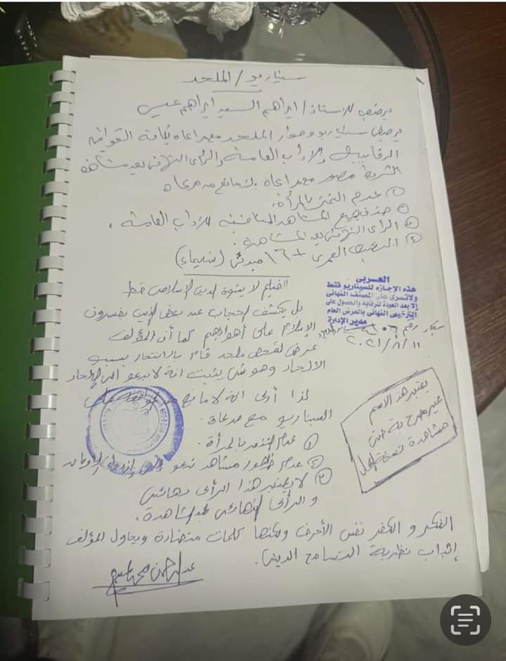 واختتم: و ده ينفي تماما الهراء بتاع اصل الصناع بيعملوا دعاية رخيصة للفيلم … و مرفق مع البوست صورة الترخيص و صورة اجازة الرقابه للسيناريو .. اللي لاول مرة الرقابه تكتب في الورقة الاخيرة للسيناريو ما يشبه الشكر و التوضيح .. و ده نص ما كتب علي الورقة الاخيرة