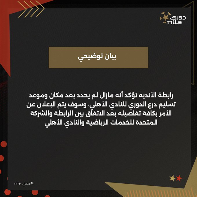 رابطة الأندية تؤكد أنه مازال لم يحدد بعد مكان وموعد تسليم درع الدوري للنادي الأهلي، وسوف يتم الإعلان عن الأمر بكافة تفاصيله بعد الاتفاق بين الرابطة والشركة المتحدة للخدمات الرياضية والنادي الأهلي.
