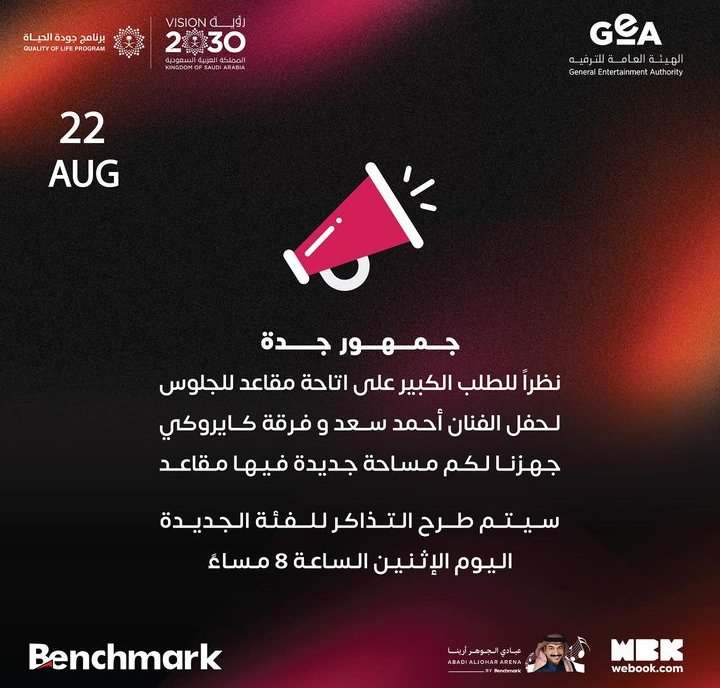 ونشرت شركة بنش مارك عبر صفحتها الرسمية بموقع تبادل الصور والفيديوهات انستجرام، منشور رصده موقع تحيا مصر وتقول به: "جمهور جدة، نظرا للطلب الكبير على إتاحة مقاعد للجلوس في حفل الفنان أحمد سعد وفريق كايروكي، جهزنا لكم مساحة جديدة بها مقاعد.. سيتم طرح فئة جديدة اليوم الاثنين الساعة 8 مساء.