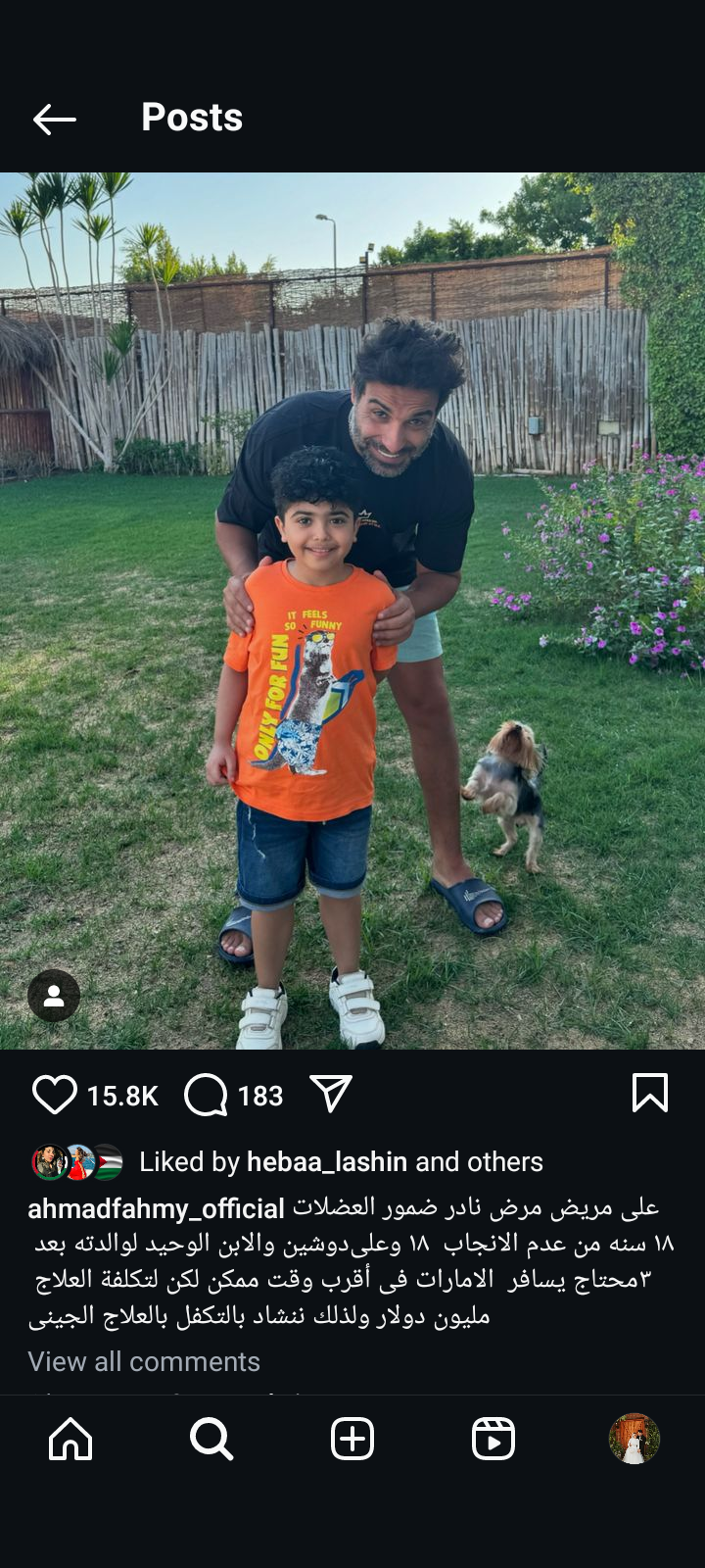 ونشر أحمد فهمي صورته رفقة هذا الطفل عبر حسابه الرسمي بموقع تبادل الصور والفيديوهات انستجرام في منشور رصده موقع تحيا مصر، وعلق عليه قائلا: على مريض مرض نادر ضمور العضلات دوشين والابن الوحيد لوالدته بعد ١٨ سنه من عدم الانجاب ١٨ وعلى محتاج يسافر الامارات فى أقرب وقت ممكن لكن لتكلفة العلاج ٣ مليون دولار ولذلك ننشاد بالتكفل بالعلاج الجينى.
