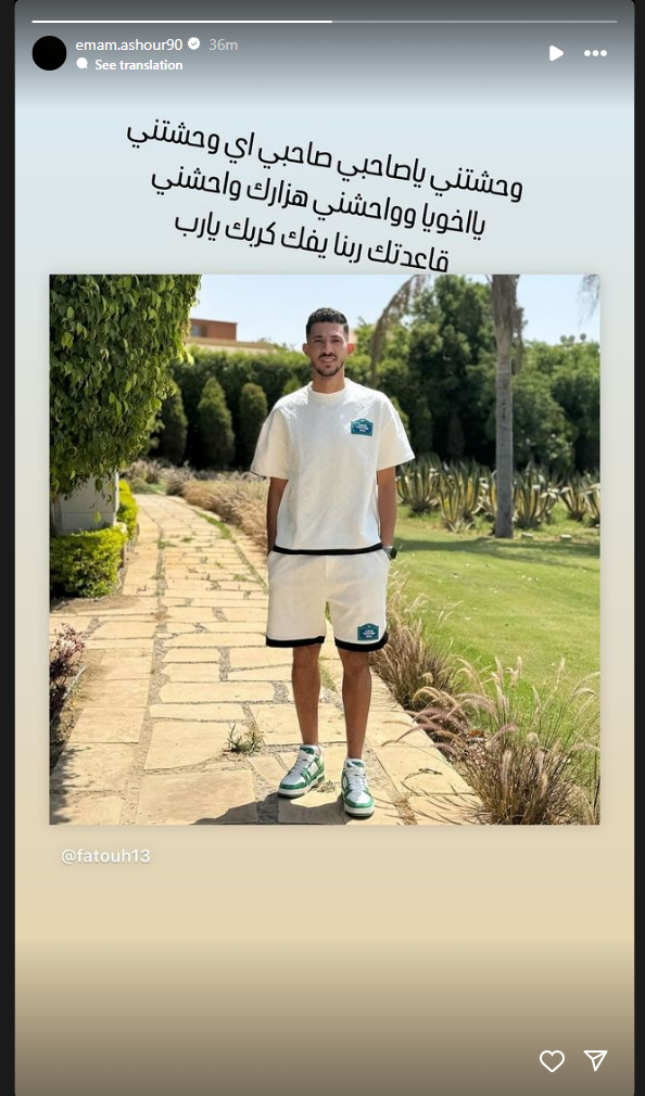 تحيا مصر، وكتب إمام عاشور عبر حسابه الرسمي"إنستجرام":"وحشتني يا صاحبي صاحبي أي وحشتني يا أخويا وواحشني هزارك واحشني قاعدتك ربنا يفك كربك يارب".