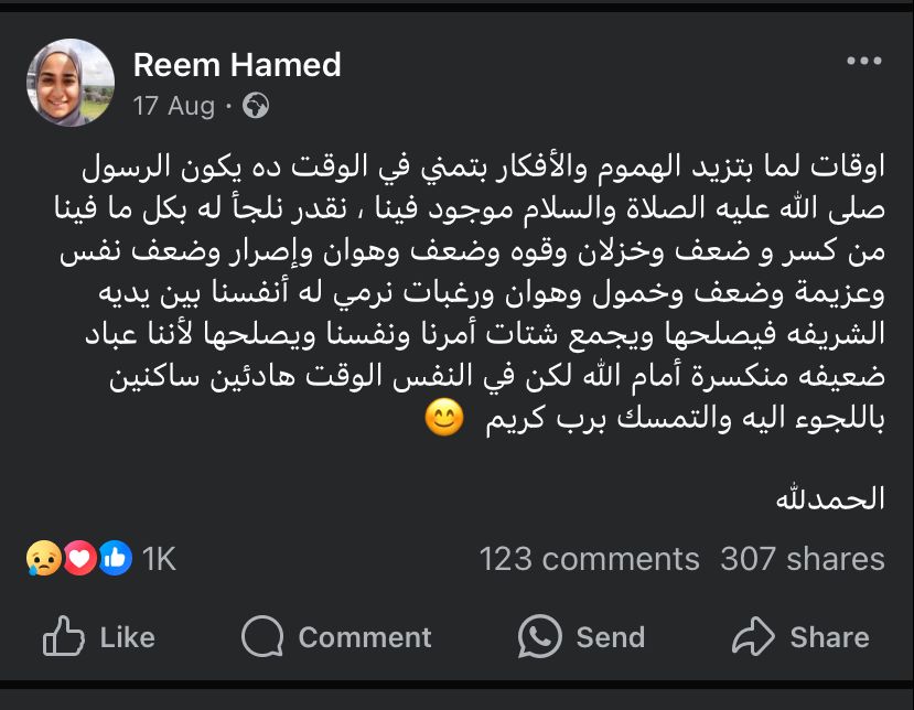 وكان من بين أخر المنشورات التي كتبتها الباحثة ريم حامد على صفحتها الشخصيةن “أوقات لما بتزيد الهموم والأفكار بتمنى في الوقت ده يكون الرسول صلى الله عليه الصلاة والسلام موجود فينا، نقدر نلجأ له بكل ما فينا من كسر وضعف وخمول وهوان ورغبات، نرمي للرسول له أنفسنا بين يديه الشريفة فيصلحها ويجمع شتات أمرنا ونفسنا ويصلحها لأننا عباد ضعيفة منكسرة أمام الله لكن في نفس الوقت هادئين ساكنين بـ اللجوء إليه والتمسك بـ رب كريم.. الحمدلله”.