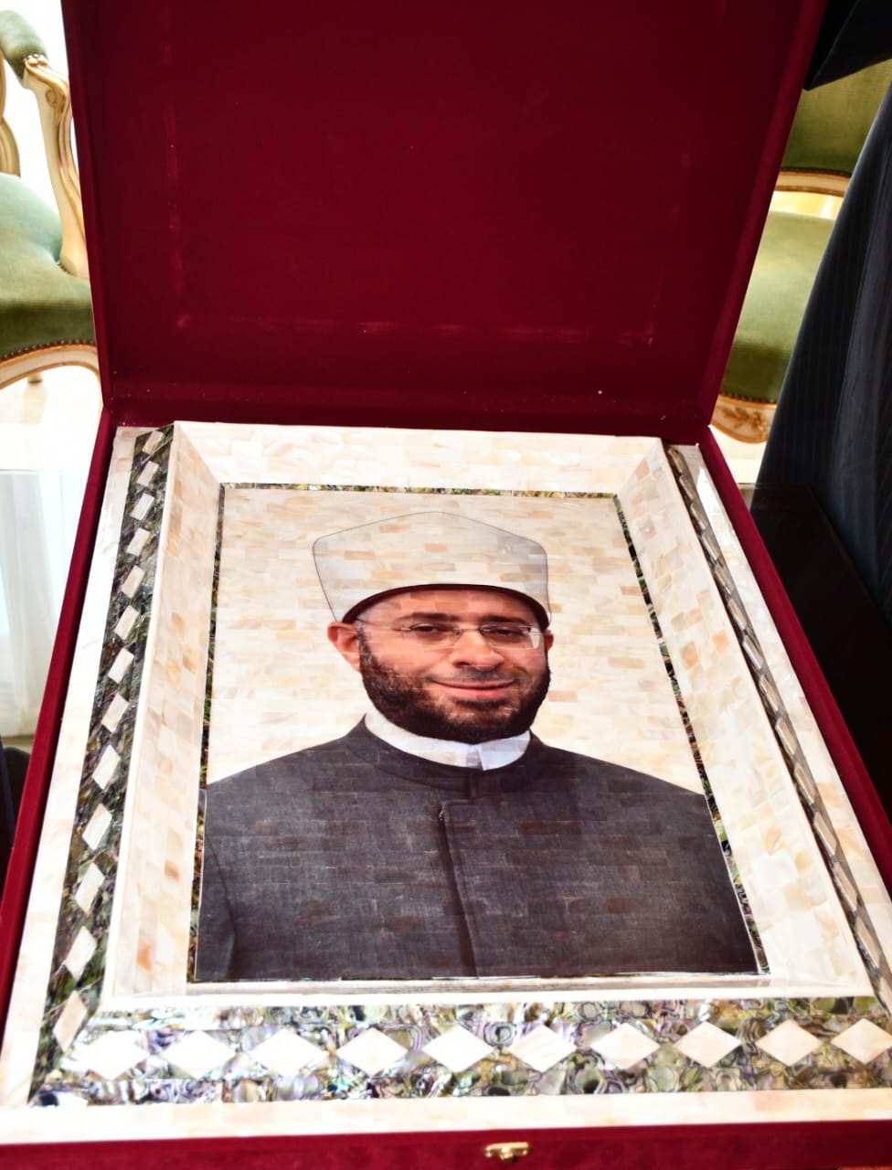 وقدم قاضي قضاة فلسطين لوحة خزفية تحمل صورة الأستاذ الدكتور أسامة الأزهري صنعت خصيصًا في فلسطين بنفس الطريقة المتوارثة في التراث الحرفي الفلسطيني على امتداد ٧٠٠ سنة مضت، حيث تشتهر مدن فلسطينية كبيت لحم والخليل بهذه الصناعات الصدفية منذ 700عام ، حيث أضحت هذه الصناعة تراثًا فلسطينيًّا مميزًا.