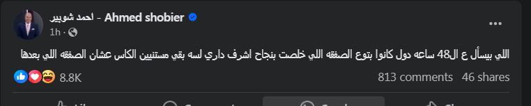 تحيا مصر، وكتب شوبير عبر حسابه الرسمي"فيسبوك":": اللي بيسأل على الـ48 ساعه دول كانوا بتوع الصفقه اللي خلصت بنجاح أشرف داري لسه بقي مستنيين الكاس عشان الصفقه اللي بعدها ".