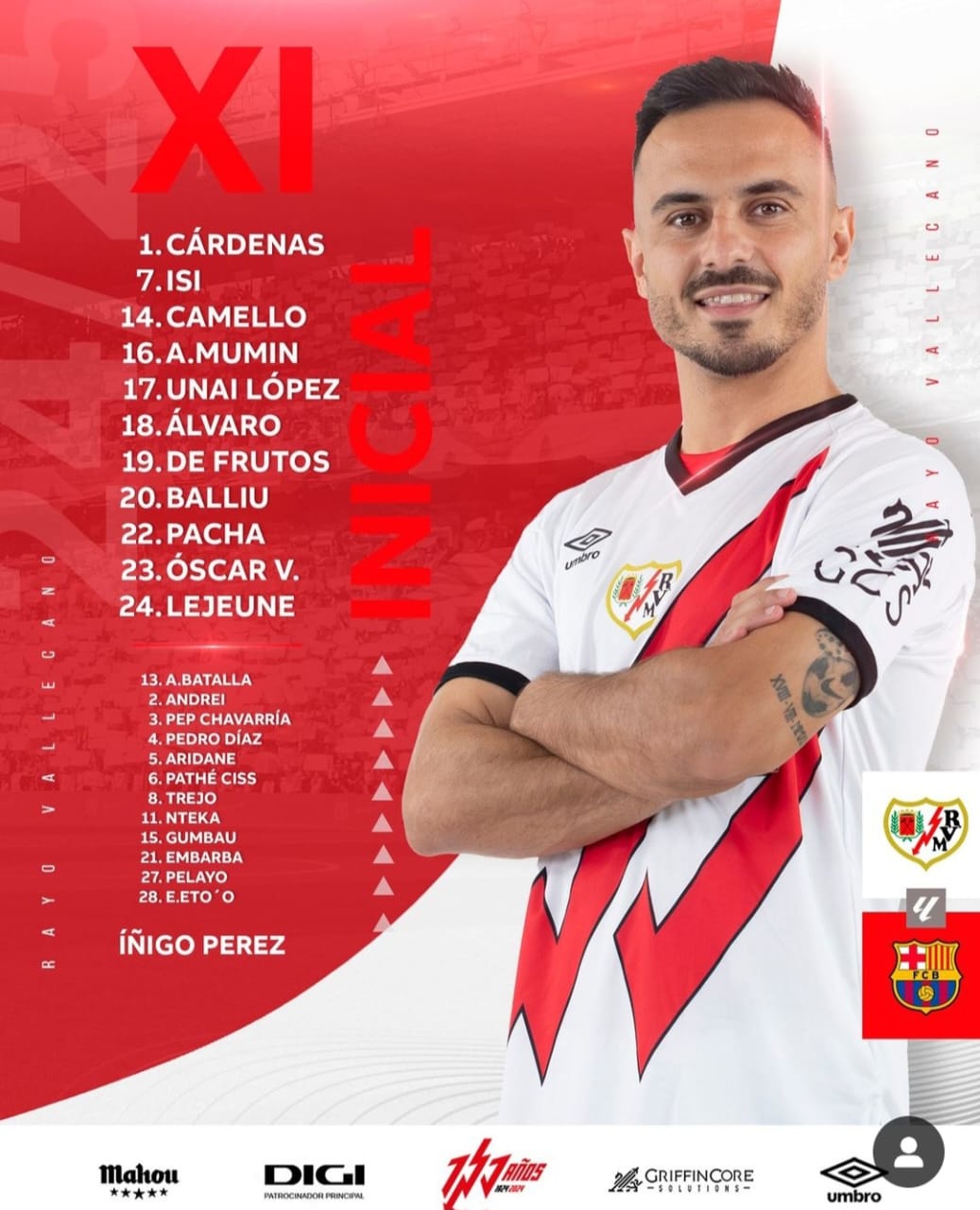 جاءت اختيارات أنيجو بيريز سوتو، المدير الفني لنادي رايو فايكانو، لمواجهة برشلونة في الجولة الثالثة من الدوري الإسباني، كما يلي: