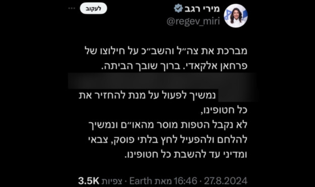 وذكرت القناة العبرية أنه، في التغريدة هنأت الوزيرة ريغيف الجيش الإسرائيلي والشاباك على (إنقاذ) المختطف فرحان القاضي وخرقت تعليمات الرقابة..وبعد حوالي 40 دقيقة قامت ريجيف بإزالة التغريدة