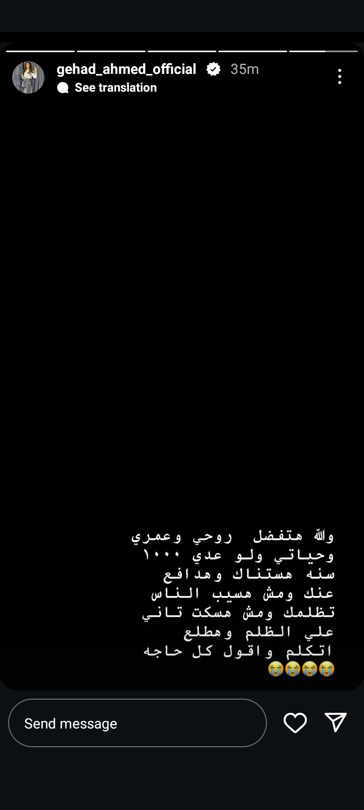 وكتبت زوجة عصام صاصا في المنشور الذي رصده موقع تحيا مصر عبر خاصة ستوري بحسابها الرسمي بموقع انستجرام: والله هتفضل روحي وعمري وحياتي ولو عدى ألف سنة هفضل ادافع عنك ومش هسيب الناس تظلمك ومش هسكت تاني على الظلم وهطلع أتكلم في كل حاجة.