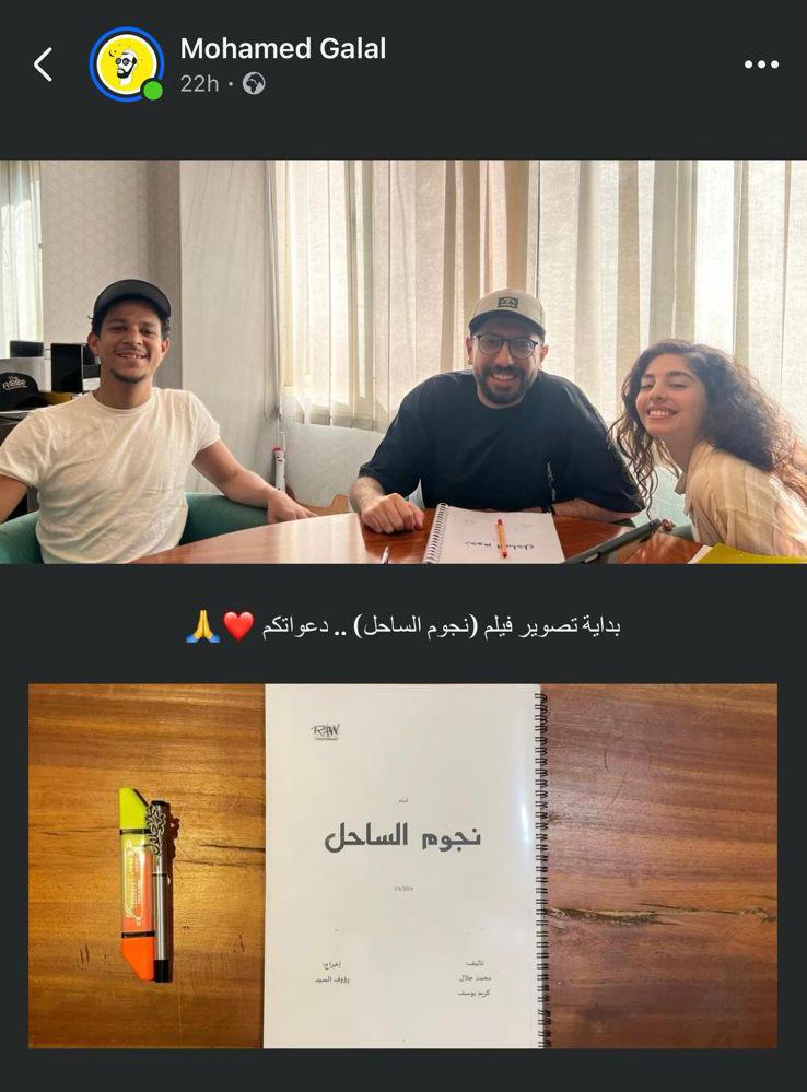 وأشار السيناريست محمد جلال إلى بدء تصوير فيلم نجوم الساحل حيث كتب على منشوره عبر حسابه الرسمي بموقع التواصل الاجتماعي فيسبوك ورصده موقع تحيا مصر: بداية تصوير فيلم نجوم الساحل.. دعواتكم.