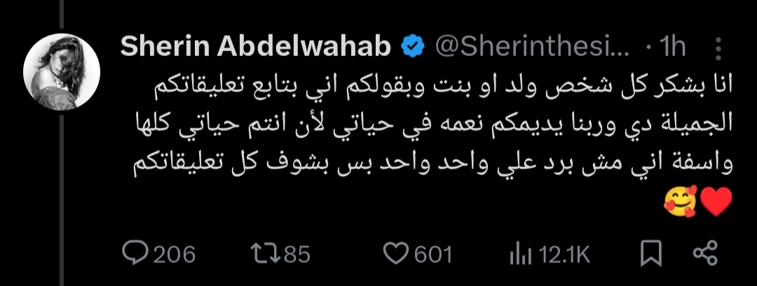 وقالت شيرين عبد الوهاب في رسالتها لجمهورها التي حرصت فيها على توجيه الشكر لكل من يتابعها مؤكدة على أهمية الجمهور في حياتها، وقالت شيرين عبد الوهاب في منشورها الذي يرصده موقع تحيا مصر: “انا بشكر كل شخص ولد او بنت وبقولكم اني بتابع تعليقاتكم الجميلة دي وربنا يديمكم نعمه في حياتي لأن انتم حياتي كلها واسفة اني مش برد علي واحد واحد بس بشوف كل تعليقاتكم”.