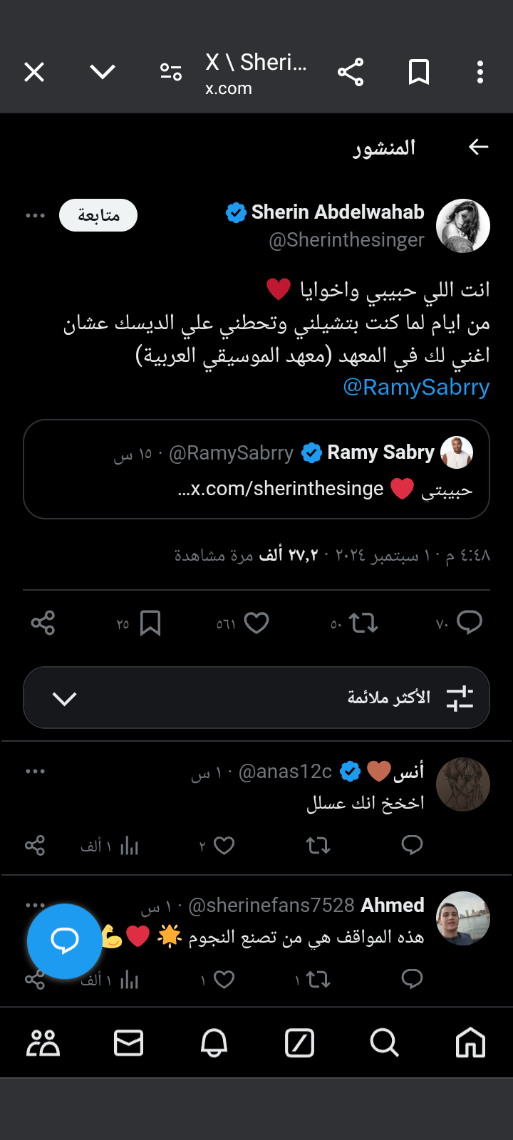 من جانبه ردت عليه شيرين عبد الوهاب متسعيدة ذكرياتها مع رامي صبري في معهد الموسيقى العربية، قائلة في منشور رصده موقع تحيا مصر: انت اللي حبيبي واخوايا من ايام لما كنت بتشيلني وتحطني علي الديسك عشان اغني لك في المعهد "معهد الموسيقي العربية".