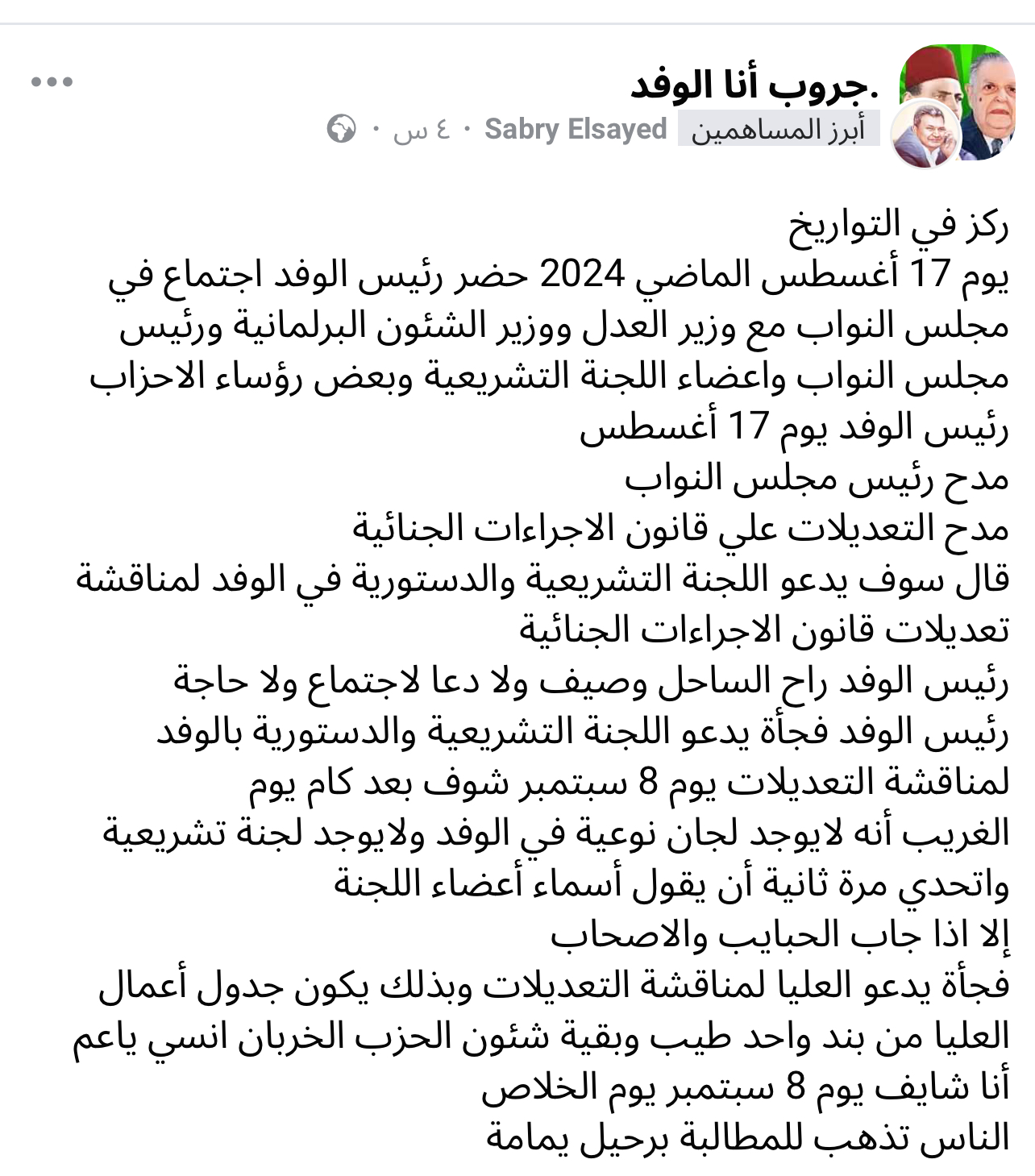 وكان عدد من أعضاء حزب الوفد تداولوا منشورات على جروبات الحزب تفيد عدم وجود لجنة تشريعية للحزب .