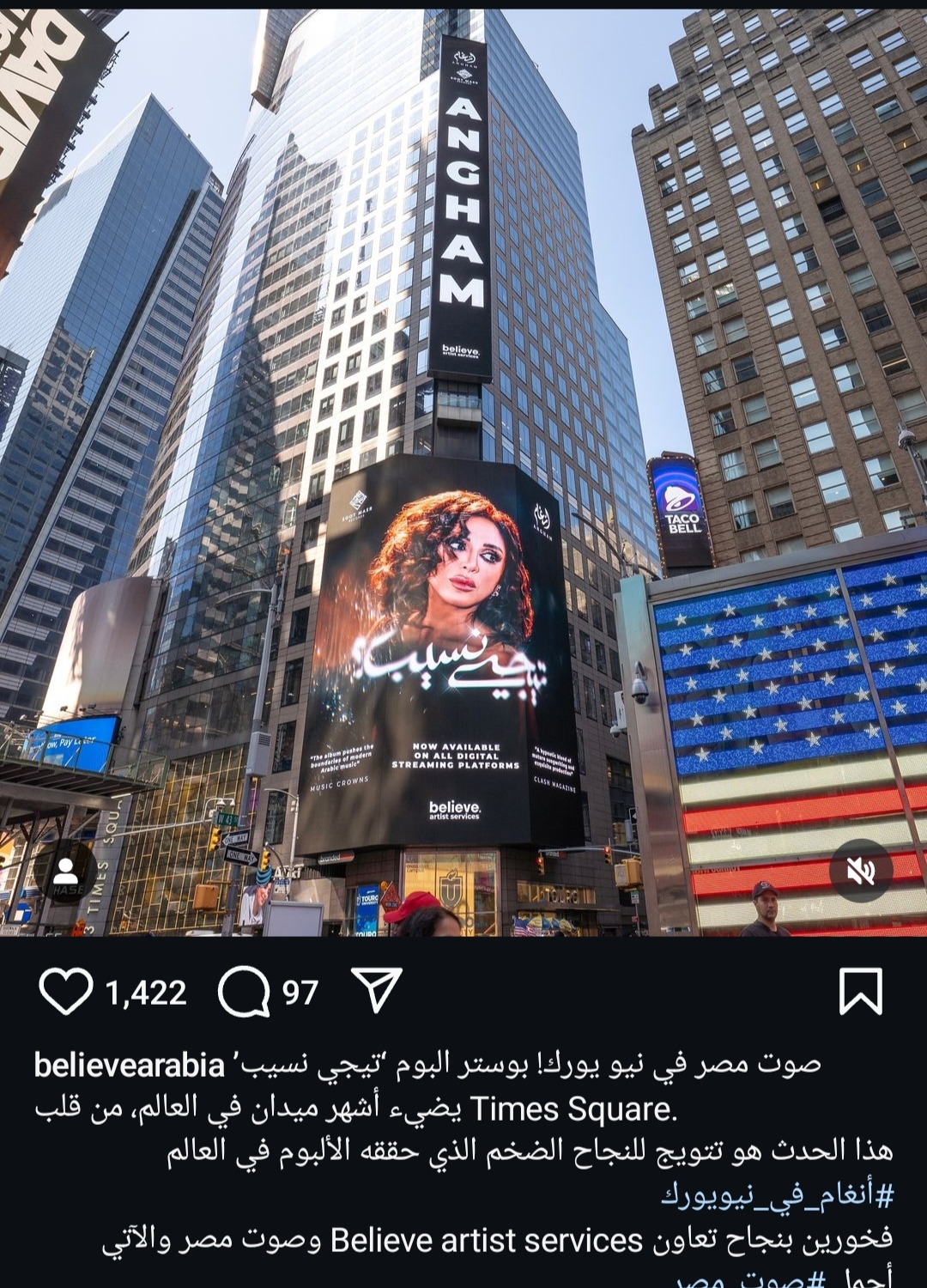 كتبت الصفحة الرسمية للفنانة أنغام عبر موقع تبادل الصور والفيديوهات انستجرام في منشور يرصده موقع تحيا مصر: “صوت مصر في نيو يورك بوستر البوم تيجي نسيب يضيء أشهر ميدان في العالم من قلب Times Square هذا الحدث هو تتويج للنجاح الضخم الذي حققه الألبوم في العالم، فخورين بنجاح تعاون Believe artist services وصوت مصر والآتي أجمل”.