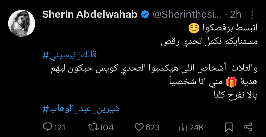 شاركت النجمة شيرين عبد الوهاب منشور عبر تطبيق التغريدات إكس «تويتر سابقًا»، وأعلنت شيرين عبد الوهاب من خلال منشورها توافر هدايا لأفضل 3 الفائزين في تحدي الرقص، وحمست شيرين عبد الوهاب جمهورها ومتابعينها للتحدي الذي أطلقته عبر حسابها الرسمي على موقع تبادل الصور والفيديوهات انستجرام، وقالت شيرين عبد الوهاب في منشورها الذي يرصده موقع تحيا مصر: "اتبسط برقصكوا مستنايكم نكمل تحدي رقص والتلات أشخاص اللى هيكسبوا التحدي كويس حيكون ليهم هدية مني أنا شخصيًا.. يالا نفرح كلنا"، ويعد هذا التحدي من بين خطوات شيرين للعودة إلى جمهورها ومخاطبته بعد الأزمات العديدة التي مرت بها الفترة الأخيرة وبالفعل بدأت شيرين في العودة ويزداد تفاعل جمهورها معها ودعمه لها يوم بعد يوم أكثر.