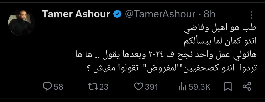 شارك الفنان تامر عاشور رسالة غامضة لأحد الشخصيات العامة لمن دون أن يذكر من يقصد بحديثه، وذلك من خلال منشور عبر حسابه الرسمي على موقع التغريدات إكس «تويتر سابقًا»، وأشار تامر عاشور في رسالته التي يرصدها موقع تحيا مصر إلى أحد الموسيقيين لكن دون أن يذكر اسمه بل اكتفى بتوجيه الرسالة له، كما وجه اللوم إلى الصحفيين بسبب ردهم عليه الغير مناسب لمهنتهم، وقال تامر عاشور في منشوره الذي أثار به الجدل: “طب هو أهبل وفاضي انتم كمان لما يسألكم هاتولي عمل واحد نجح في 2024.. المفروض انتوا كصحفيين تقولوا مفيش!!”
