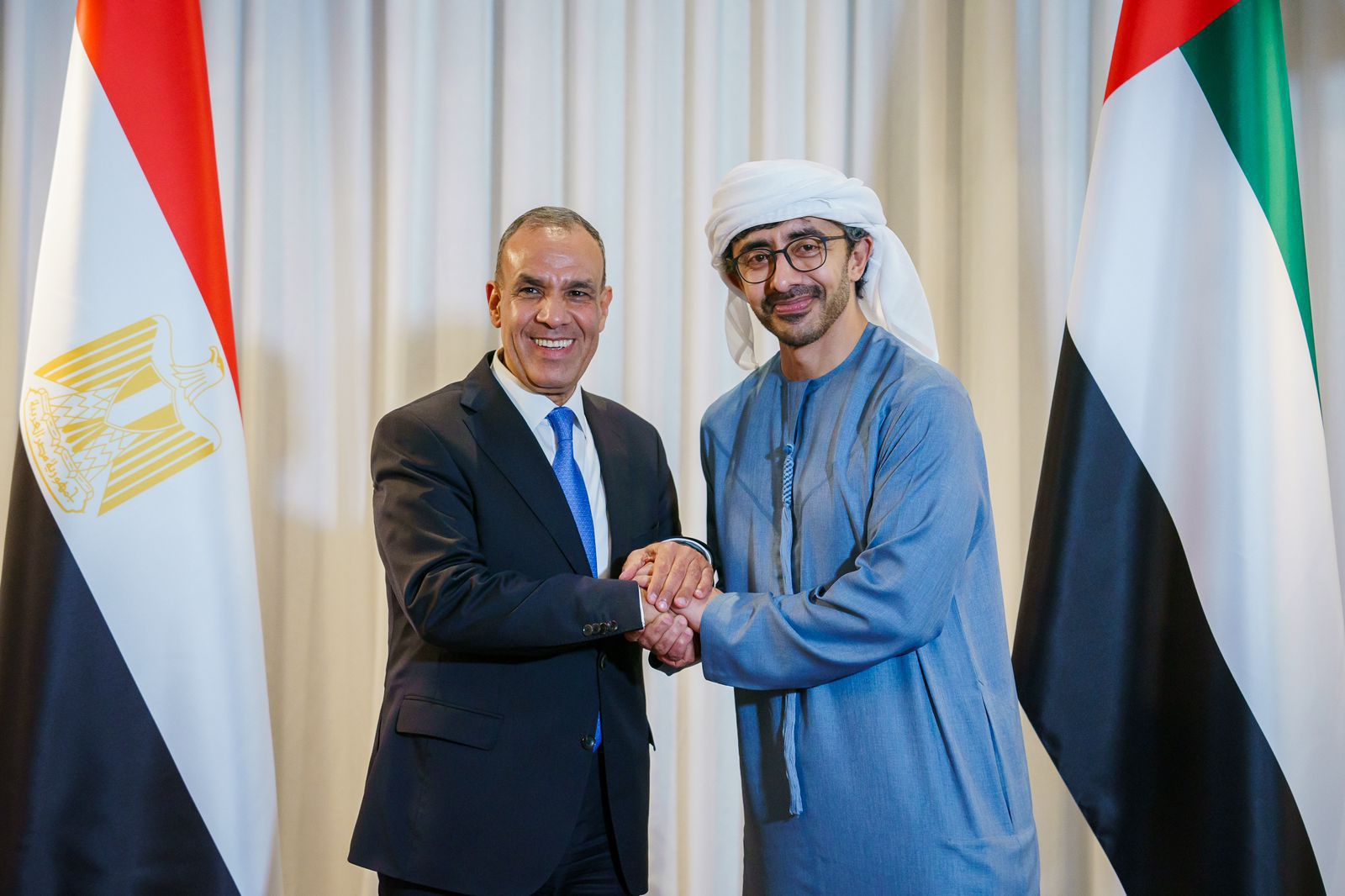 عقد د. بدر عبد العاطي وزير الخارجية والهجرة وشئون المصريين في الخارج، جلسة مباحثات موسعة مع الشيخ عبد الله بن زايد آل نهيان نائب رئيس الوزراء ووزير خارجية الإمارات، وذلك بحضور كل من الشيخ شخبوط بن نهيان وزير الدولة للشئون الأفريقية بوزارة الخارجية الإماراتية، والسفيرة لانا نسيبة المبعوث الخاص للإمارات إلى الاتحاد الأوروبي ومديرة إدارة العلاقات الدولية بوزارة الخارجية، وكذلك بحضور السفير شريف عيسى سفير مصر لدى الإمارات.