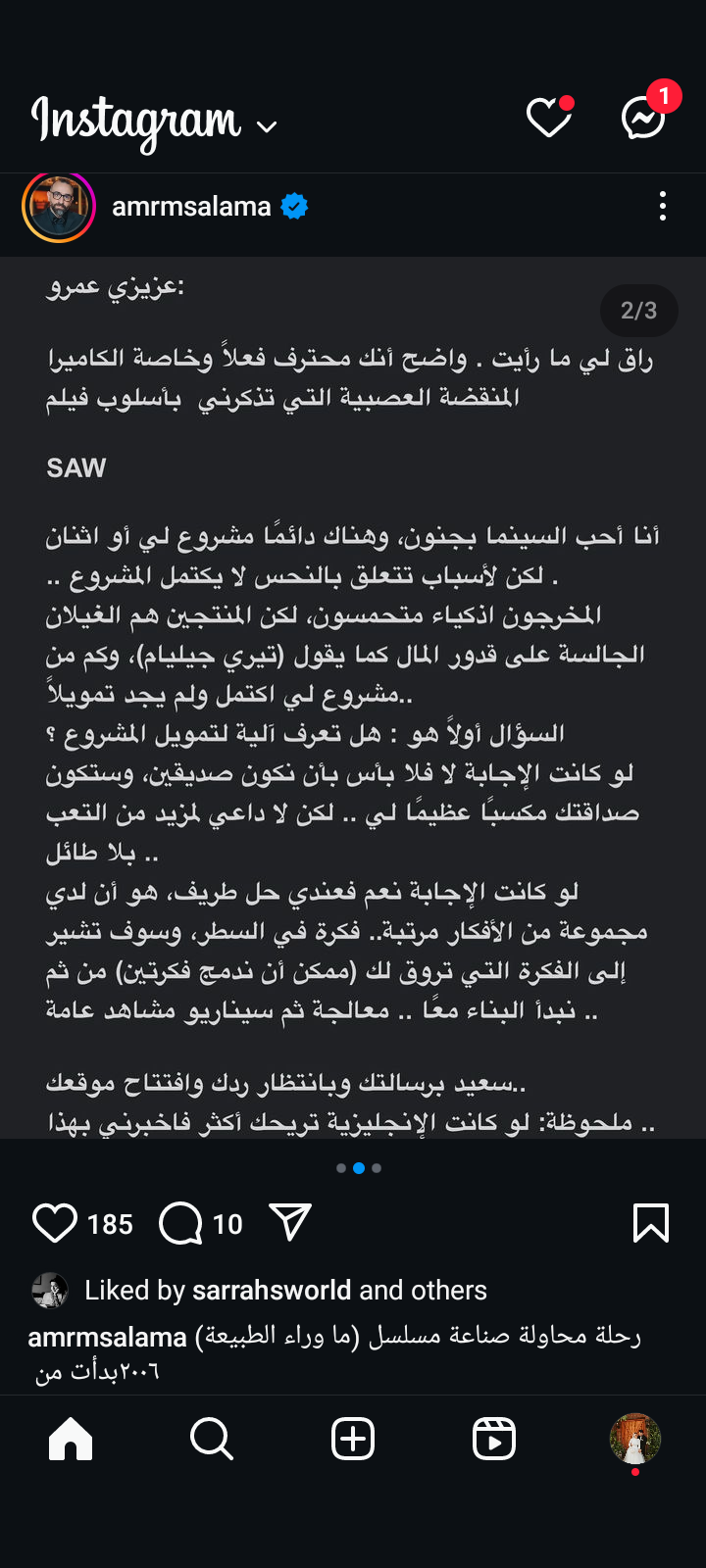 وكتب عمرو سلامة في منشور رصده موقع تحيا مصر عبر حسابه الرسمي بموقع تبادل الصور والفيديوهات انستجرام: رحلة محاولة صناعة مسلسل (ما وراء الطبيعة) بدأت من ٢٠٠٦.