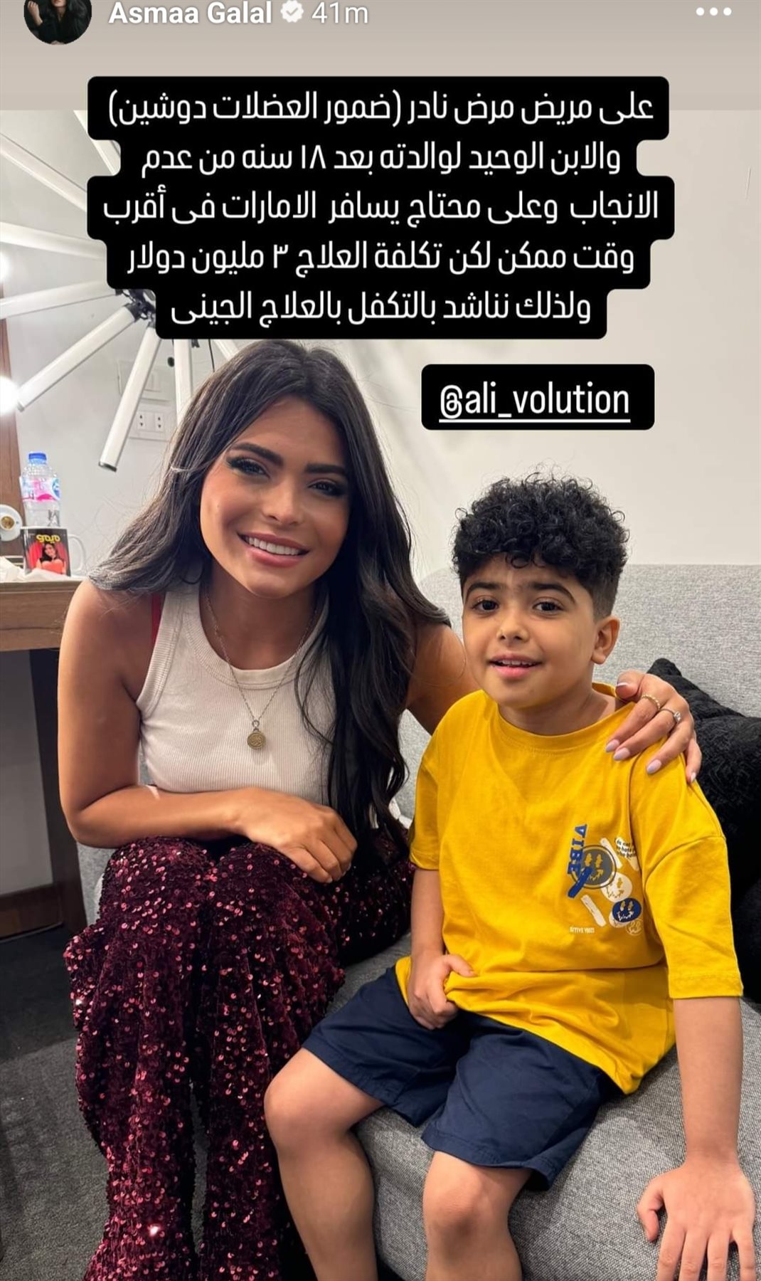 أرفقت الفنانة أسماء جلال صوره تجمعها بطفل مريض مرض نادر يدعى علي من خلال خاصية القصص القصيره عبر حسابها الرسمي على موقع التواصل الاجتماعي فيسبوك وشاركت أسماء جلال من خلال الصورة في حملة الفنانين لدعم الطفل عليه وناشدت الإمارات للتكفل بعلاجه الذي يتكلف 3 مليون دولار ولا تستطيع أسرته تكفل المصاريف وكتبت اسماء جلال معلقه على صورتها مع الطفل عليه التي يرصدها موقع تحيا مصر: “علي مريض مرض نادر ضمور العضلات دوشين والابن الوحيد لوالدته بعد 18 سنة من عدم الإنجاب وعلي محتاج يسافر الإمارات في أقرب وقت ممكن لكن تكلفة العلاج 3 مليون دولار ولذلك نناشد بالتكفل بالعلاج الجيني”.