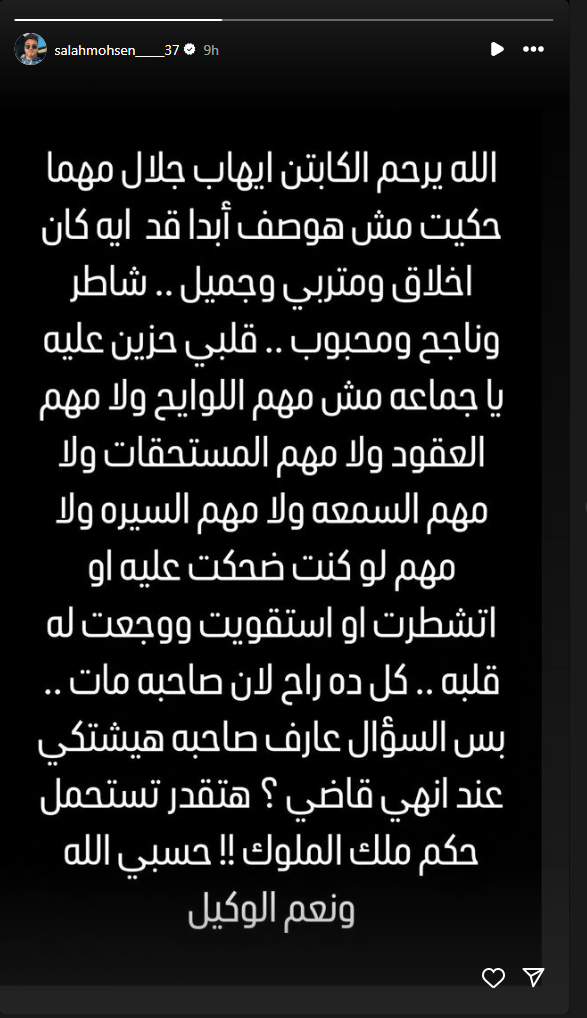 وكتب صلاح محسن عبر حسابه الرسمي "إنستجرام":" الله يرحم كابتن إيهاب جلال مش هوصف أبداً قد ايه كان اخلاق ومتربي وجميل، وشاطر وناجح ومحبوب.. قلبي حزين عليه يا جماعة مش مهم اللوايح ولا مهم العقود ولامهم المستحقات ولا مهم السمعة ولامهم السيره ولا مهم كنت ضحكت عليه أو اتشطرت أو استقويت ووجعت له قلبه.. كل ده راح لأن صاحبه مات.. بس السؤال عارف صاحبه هيتشكي عند انهي قاضي؟ هتقدر تستحمل حكم ملك الملوك؟؟ حسبي الله ونعم الوكيل".