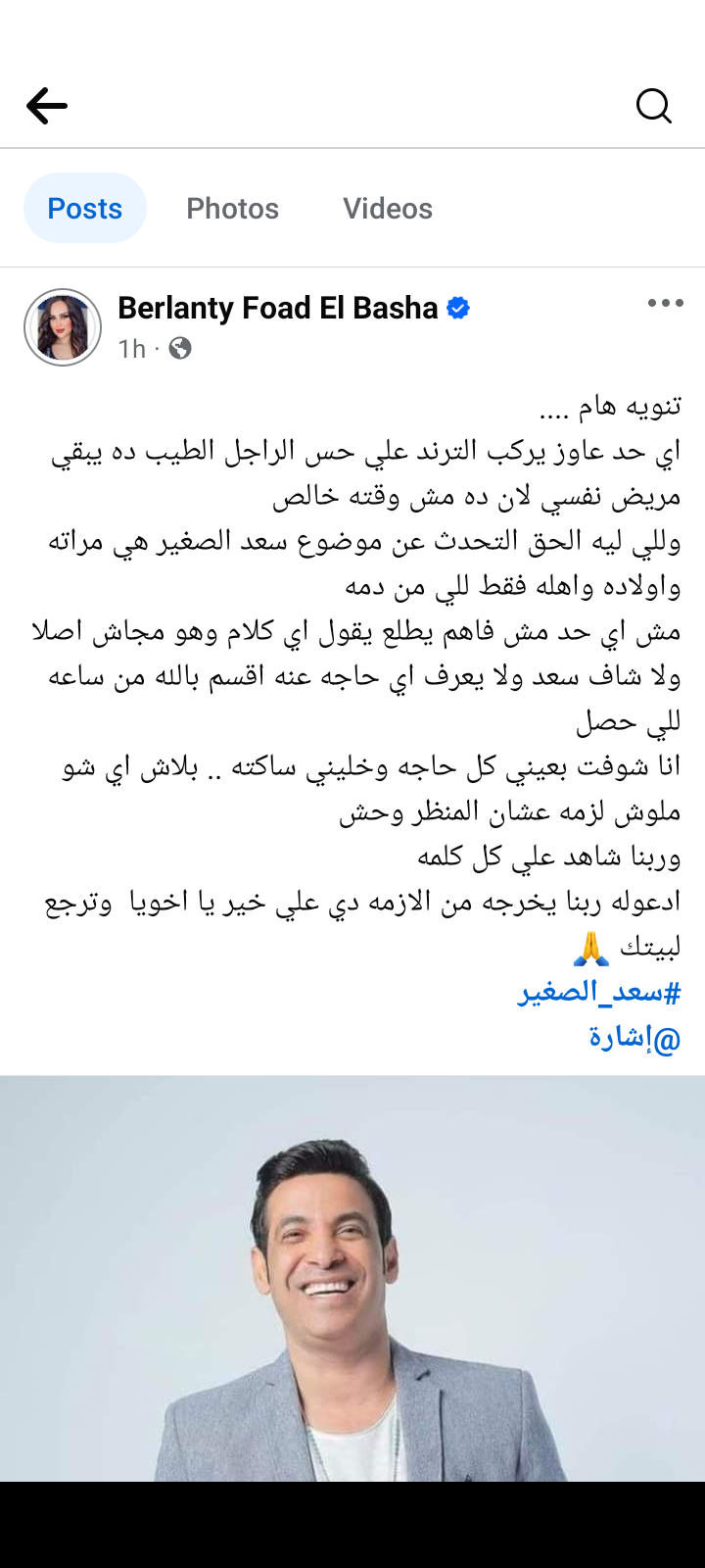 وكتبت الفنانة برلنتي فؤاد في منشور رصده موقع تحيا مصر عبر حسابها الرسمي بموقع التواصل الاجتماعي فيسبوك: تنويه هام .... اي حد عاوز يركب الترند علي حس الراجل الطيب ده يبقي مريض نفسي لان ده مش وقته خالص وللي ليه الحق التحدث عن موضوع سعد الصغير هي مراته واولاده واهله فقط للي من دمه.