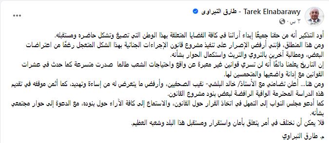 ودعا المهندس طارق النبراوي، مجلس النواب إلى التمهل في اتخاذ القرار حول القانون، والاستماع إلى كافة الآراء حول بنوده، مع الدعوة إلى حوار مجتمعي بشأنه، فلا يمكن أن نختلف في أمر يتعلق بأمان واستقرار ومستقبل هذا البلد وشعبه العظيم.